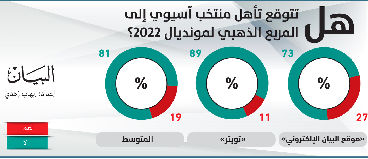 تشارك 6 منتخبات آسيوية في كأس العالم 2022، وهي قطر الدولة المضيفة، والسعودية، واليابان، وكوريا الجنوبية، وإيران، وأستراليا، ومع الوصول إلى هذا الرقم القياسي التاريخي الجديد للقارة في المونديال، طرحت «البيان» سؤالاً في الاستطلاع الأسبوعي حول التوقعات بشأن إمكانية تأهل منتخب آسيوي إلى المربع الذهبي للمونديال، وأكد 81% مقابل 19% من إجمالي المشاركين في الاستطلاع أن وصول منتخب آسيوي إلى المربع الذهبي لكأس العالم، لن يتحقق رغم تمثيل القارة الآسيوية في البطولة بستة منتخبات، وأشارت نسبة 73% عبر موقع «البيان» الإلكتروني إلى صعوبة الأمر، مقابل 27% توقعوا قدرة آسيا على التواجد في هذه المرحلة.