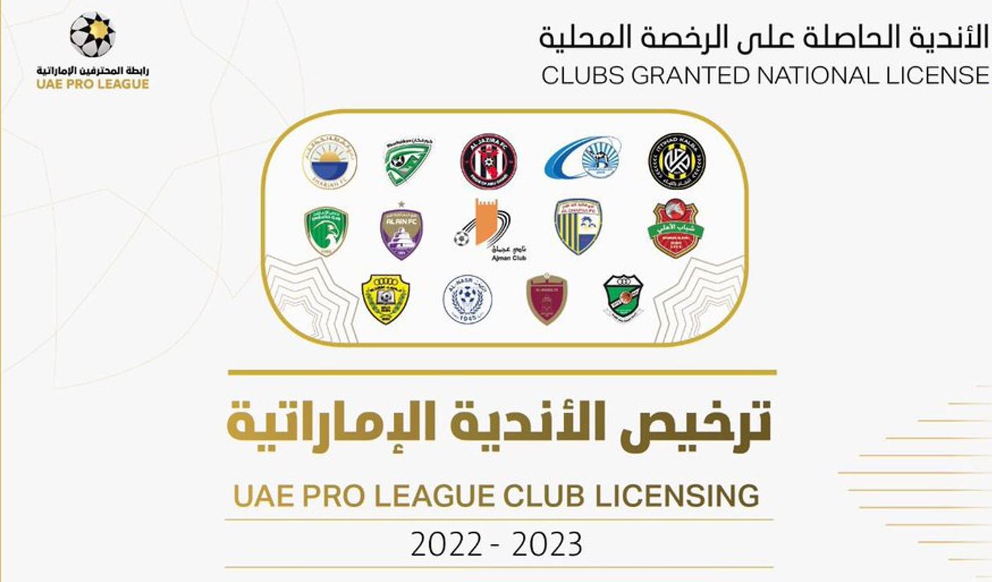 قررت لجنة التراخيص الابتدائية التابعة لنظام تراخيص الأندية الإماراتية في رابطة المحترفين منح الترخيص المحلي بدورة 2022-2023 لـ14 شركة كرة قدم في ضوء اجتيازها المعايير المطلوبة وذلك بعد الاطلاع على التقارير الخاصة بنظام التراخيص لكل منها.