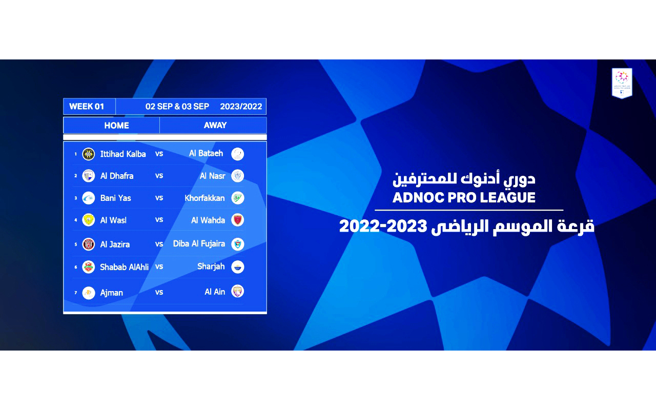 أسفرت القرعة الإلكترونية لدوري أدنوك للمحترفين أمس والتي نظمتها رابطة المحترفين، باستراحة السحب بمدينة خورفكان، عن مواجهة قوية تجمع شباب الأهلي والشارقة، في قمة مبكرة في الجولة الأولى التي تقام يومي 2 و3 سبتمبر المقبل فيما يفتتح العين «حامل اللقب» مشواره بلقاء مضيفه عجمان ويلعب كلباء مع البطائح، والظفرة مع النصر، وبني ياس مع خورفكان، والوصل مع الوحدة، والجزيرة مع دبا الفجيرة بالجولة نفسها، وراعت القرعة موازنة المباريات المهمة بواقع مباراتين كحد أقصى في كل جولة، على ألا يلعب أي فريق أكثر من مباراتين متتاليتين داخل أو خارج ملعبه، ويتضمن الدور الأول لعب كل فريق 6 مباريات بملعبه و7 خارجه أو العكس، ويلعب الجزيرة مع العين، وشباب الأهلي مع الوحدة في الجولة الثالثة يومي 15 و16 سبتمبر، ويقام ديربي النصر والوصل، بالجولة الرابعة، التي تقام يومي 1 و2 أكتوبر، ويلتقي في الجولة الخامسة، الجزيرة والشارقة في قمة خاصة ويلعب الوحدة مع النصر، وتشهد الجولة السادسة مباراتي شباب الأهلي مع الجزيرة، العين مع الوحدة، والسابعة مواجهة النصر مع العين، والثامنة، لقاءات شباب الأهلي مع العين، والجزيرة مع الوصل والشارقة مع الوحدة، والتاسعة، مواجهة النصر والجزيرة، والعاشرة، 3 قمم تجمع الأولى شباب الأهلي مع النصر، والثانية الجزيرة مع الوحدة، والثالثة، الشارقة مع العين، وتشهد الجولة 11 مواجهة مهمة بين الوصل وشباب الأهلي، والجولة 12 مواجهة العين والوصل، والجولة 13 لقاء الشارقة مع النصر.