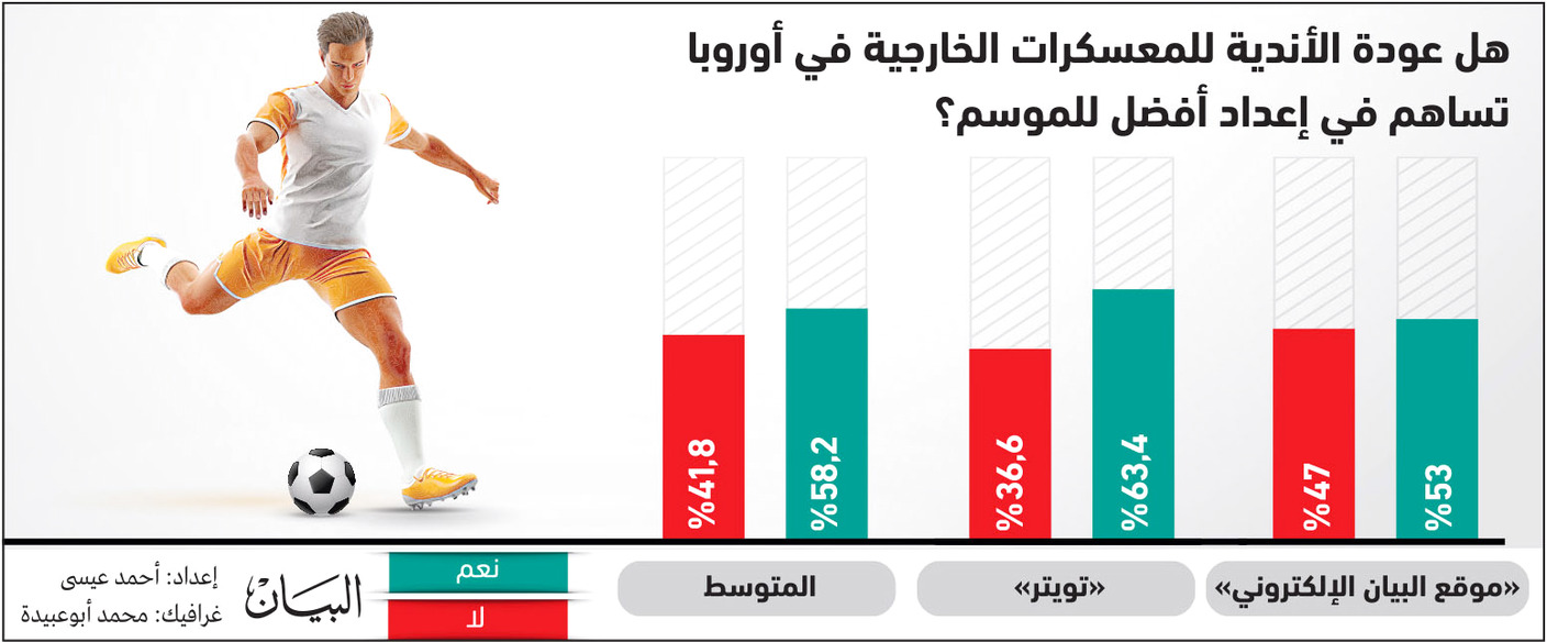 اتفق 58% من الجمهور الرياضي على أن معسكرات أنديتنا الخارجية في أوروبا، تأهباً للموسم الجديد تساهم في إعداد أفضل للفرق، بينما رأى 48% العكس، وذلك حسب نتائج الاستطلاع الأسبوعي الذي أجرته «البيان» على موقعها الإلكتروني والصفحة الرسمية بموقع التواصل الاجتماعي «تويتر»، والذي كان سؤاله المباشر: هل عودة الأندية للمعسكرات الخارجية في أوروبا تساهم في إعداد أفضل للموسم الجديد؟ ليختار غالبية المشاركين الإجابة بنعم، ما يكشف ثقتهم في معسكرات أوروبا التي تتواجد بها أنديتنا حالياً.