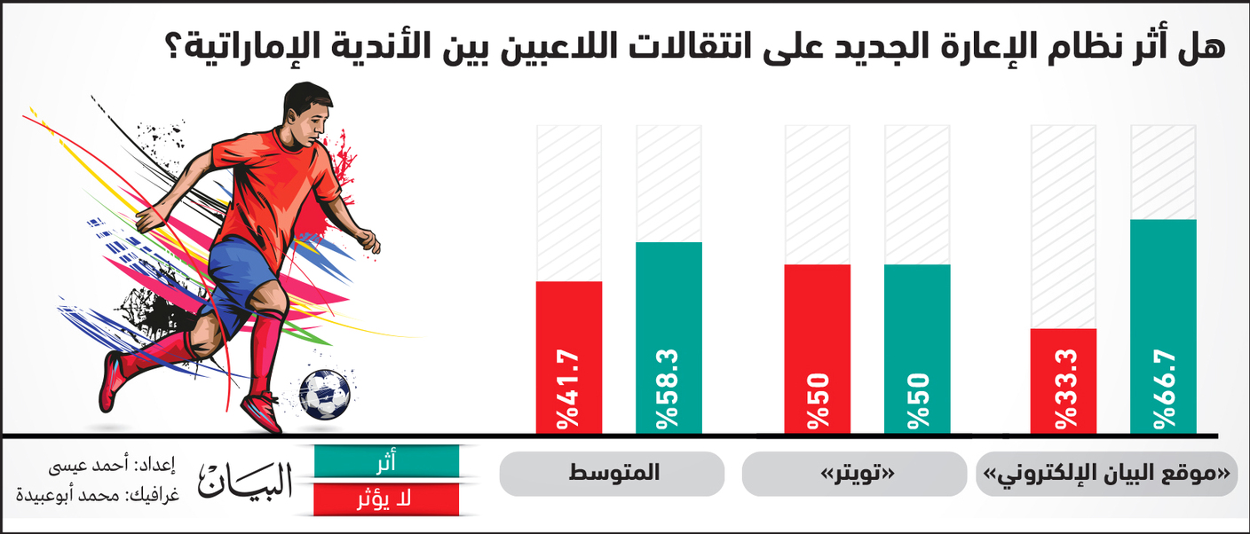كشف استطلاع أجرته «البيان» لقرائها على الموقع الإلكتروني وحسابها بموقع التواصل الاجتماعي «تويتر»، أن نسبة 58.3% على قناعة بأن التعديلات الجديدة على نظام وتحديد الإعارة بين الأندية قد أثر على سوق الانتقالات الصيفية الحالية، مقابل 41.7% من المشاركين يعتقدون العكس.