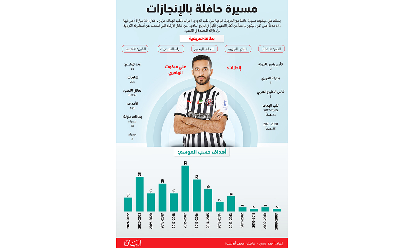 يدخل علي مبخوت مهاجم الجزيرة، الموسم الجديد بدافع كبير لمواصلة نجاحاته في الملاعب ووضع بصمته المؤثرة في تشكيلة الفريق والمساهمة مع زملائه اللاعبين في قيادته إلى منصات التتويج، مع تحد خاص يصب في مصلحة الفريق، وذلك بتقديم موسم متميز يعوض به الموسم الماضي الذي اكتفى فيه بإحراز 10 أهداف فقط، كأقل عدد من الأهداف يهز بها شباك المنافسين خلال الثمانية مواسم الماضية، وذلك نتيجة الإصابة التي قللت عدد مشاركاته وأبعدته عن 6 مباريات كاملة، وخوض عدد من المواجهات بديلاً أو دخوله في الشوط الثاني لعدم جاهزيته البدنية، إضافة إلى تراجع مستواه مع بداية الموسم ما انعكس على غيابه عن إحراز الأهداف حتى الجولة الخامسة.