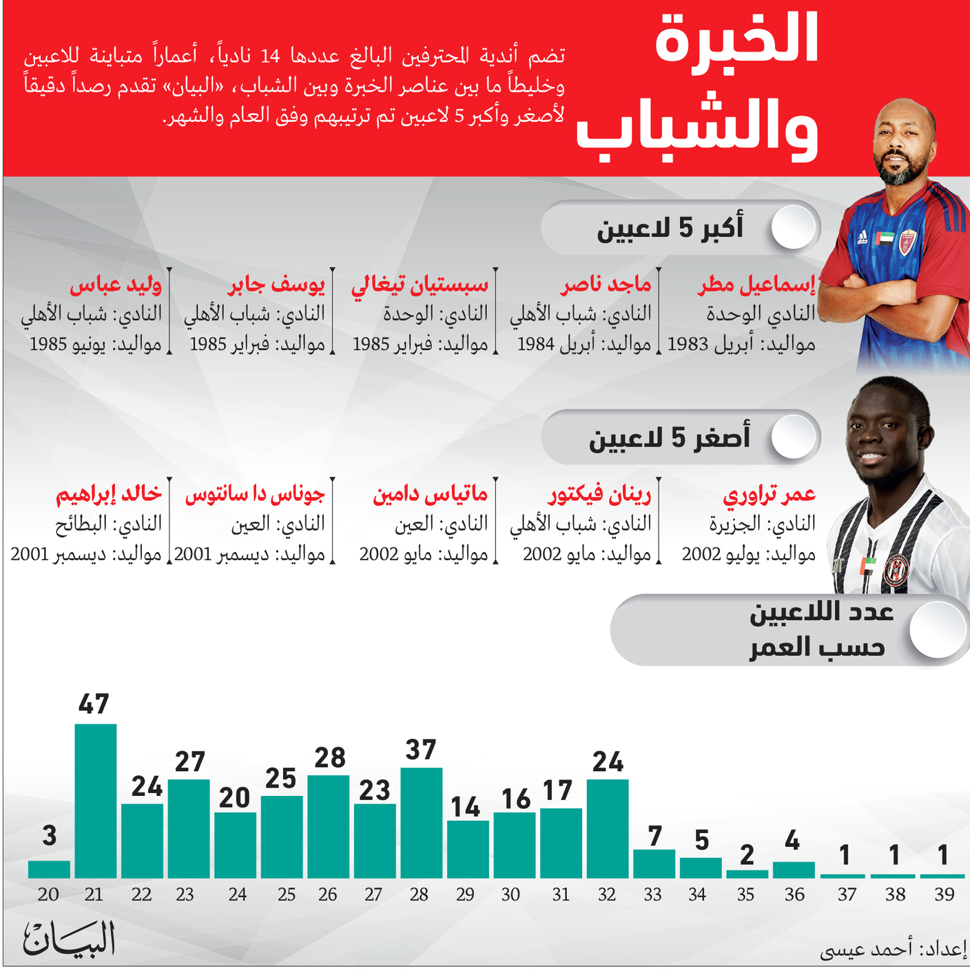يتصدر إسماعيل مطر، قائد الوحدة، نجم الكرة الإماراتية والخليجية والآسيوية، قائمة أكبر لاعبي أندية دوري المحترفين سناً، بعمر 39 عاماً، فيما يعد المالي عمر تراوري جناح الجزيرة أصغر اللاعبين، وذلك حسب الرصد الذي أجرته «البيان» لأعمار اللاعبين المقيدين في كشوف الفريق الأول بجميع الأندية التي أيضاً تستعين في بعض المباريات بلاعبين صغار السن من فرق المراحل السنية والرديف في مباريات الدوري، ولكنهم لا يوجدون ضمن قائمة الكشوف الرسمية.