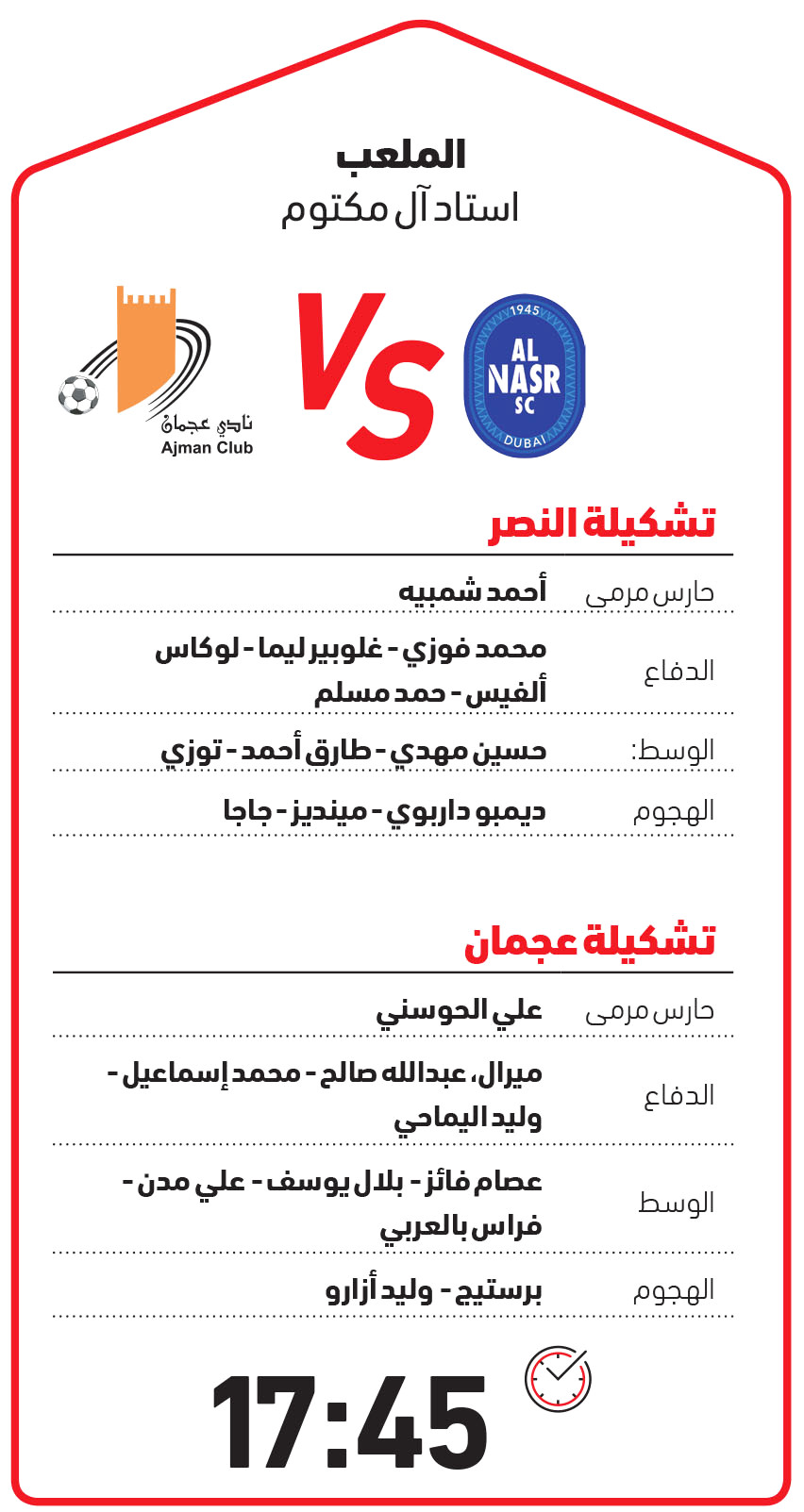 ويتطلع النصر لكسر عقدة عجمان الذي يعد أحد أشرس منافسيه في استاد آل مكتوم، حيث لم يخسر البرتقالي إلا في 3 مواجهات فقط من 10 مباريات نزل فيها ضيفاً على النصر في زمن الاحتراف، كما تفوق في مواجهتي الذهاب والغياب في الموسم الماضي.