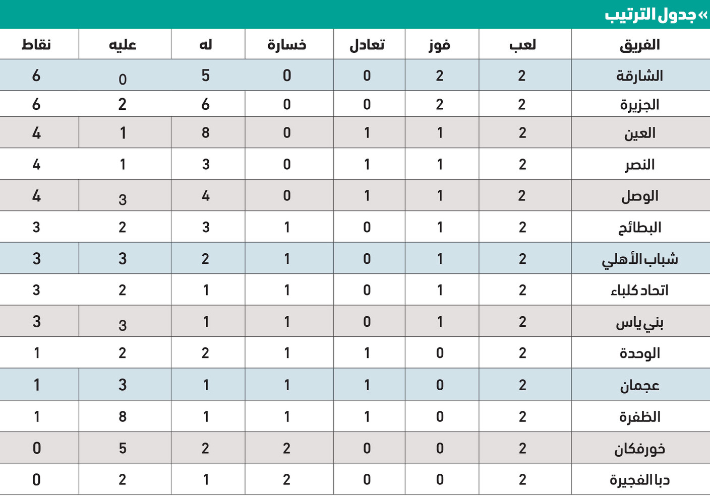 وفيما اعتلى الشارقة قمة الترتيب باستحقاق، سجل شباب الأهلي، نهوضاً بعد كبوته في الجولة الأولى من الدوري، ومغادرته المركز الأخير في لائحة الترتيب العام إلى المركز السابع، بالتوازي مع تسجيل النصر عودة مميزة تليق بكونه عميد أندية الإمارات، إثر اقتناصه نقاط مباراته مع عجمان، مقتحماً مربع أقرانه الأربعة الكبار بجدارة.