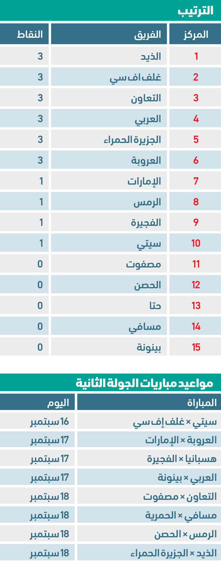 وأحكمت 6 أندية قبضتها على مراكز المقدمة بدءاً من الذيد وغلف اف سي والتعاون العربي، والجزيرة الحمراء والعروبة، وهي الفرق التي تمكنت من حصد الفوز، في وقت كسبت فيه 4 فرق نقطة وحيدة وهي الإمارات وسيتي والفجيرة المتعادل مع الرمس 2-2، فيما لا تمتلك 6 فرق أي رصيد من النقاط وهي الأندية التي خسرت مباريات الجولة الأولى وهي دبا الحصن، وحتا، وبينونة، ومصفوت، وفرسان هسبانيا، ومسافي.