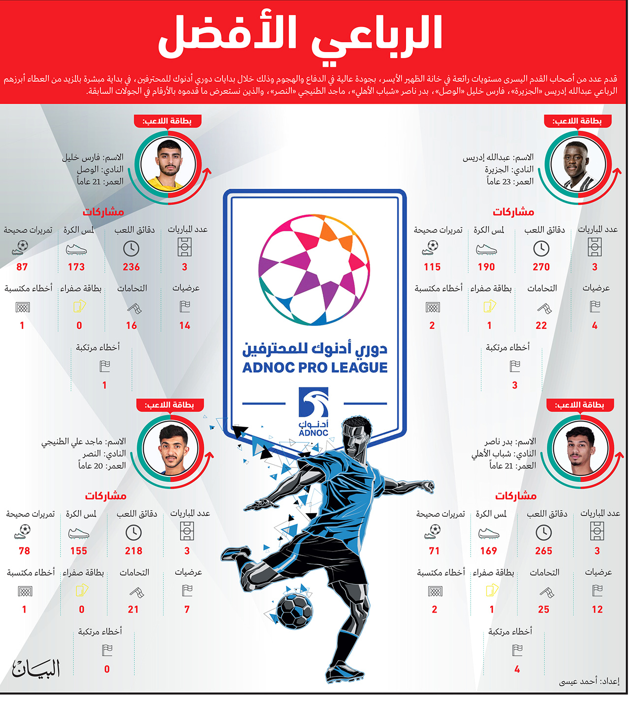 وأيضاً تألق بدر ناصر مع شباب الأهلي والذي استطاع أن يفرض نفسه على الجهاز الفني في وجود مجموعة كبيرة من العناصر صاحبة الخبرة الطويلة في الملاعب، لكنه لعب بثقة وثبات وحفظ مقعده في التشكيلة بعد أن أكد موهبته العالية، إضافة إلى عبد الله إدريس لاعب الجزيرة .