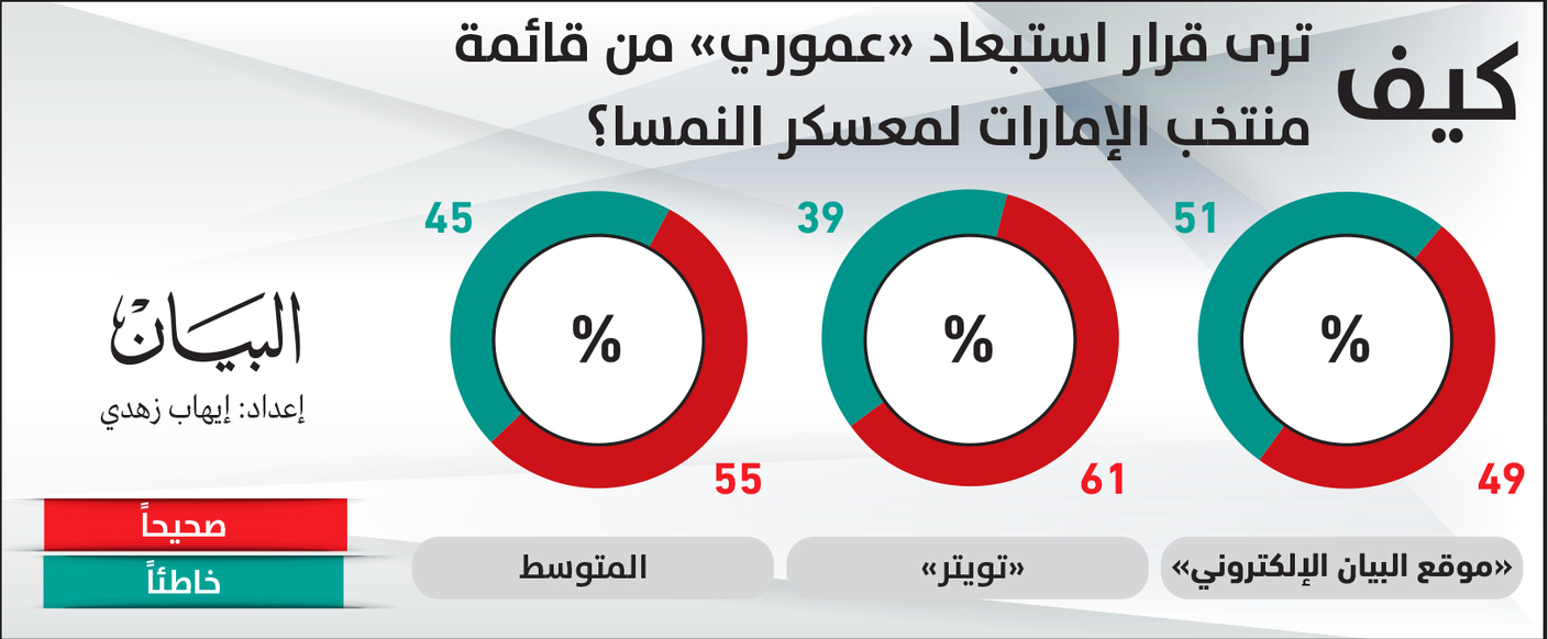 رأى 55% مقابل 45% من إجمالي المشاركين في استطلاع «البيان الرياضي»، صحة قرار استبعاد عمر عبد الرحمن (عموري) لاعب الوصل، من قائمة منتخب الإمارات الذي أقيم حالياً معسكر خارجي في النمسا، بعدما صوت 61% مقابل 39%، على صحة القرار عبر حساب «البيان الرياضي» في «تويتر»، و51% مقابل 49%، على خطأ قرار استبعاد اللاعب من خلال التصويت عبر موقع «البيان».
