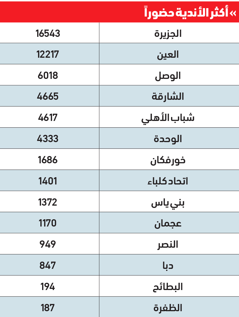 وتصدر جمهور الجزيرة قائمة الأكثر حضوراً بإجمالي 16543 مشجعاً خلال 3 مباريات، منها مباراتان على ملعبه أمام دبا والعين، شهدتا حضوراً بلغ 16085، ومواجهة واحدة بعيداً عن ملعبه أمام خورفكان في الجولة الثانية حظي خلالها «فخر أبوظبي» بمساندة 458 من محبيه، ليكون الأكثر حضوراً.