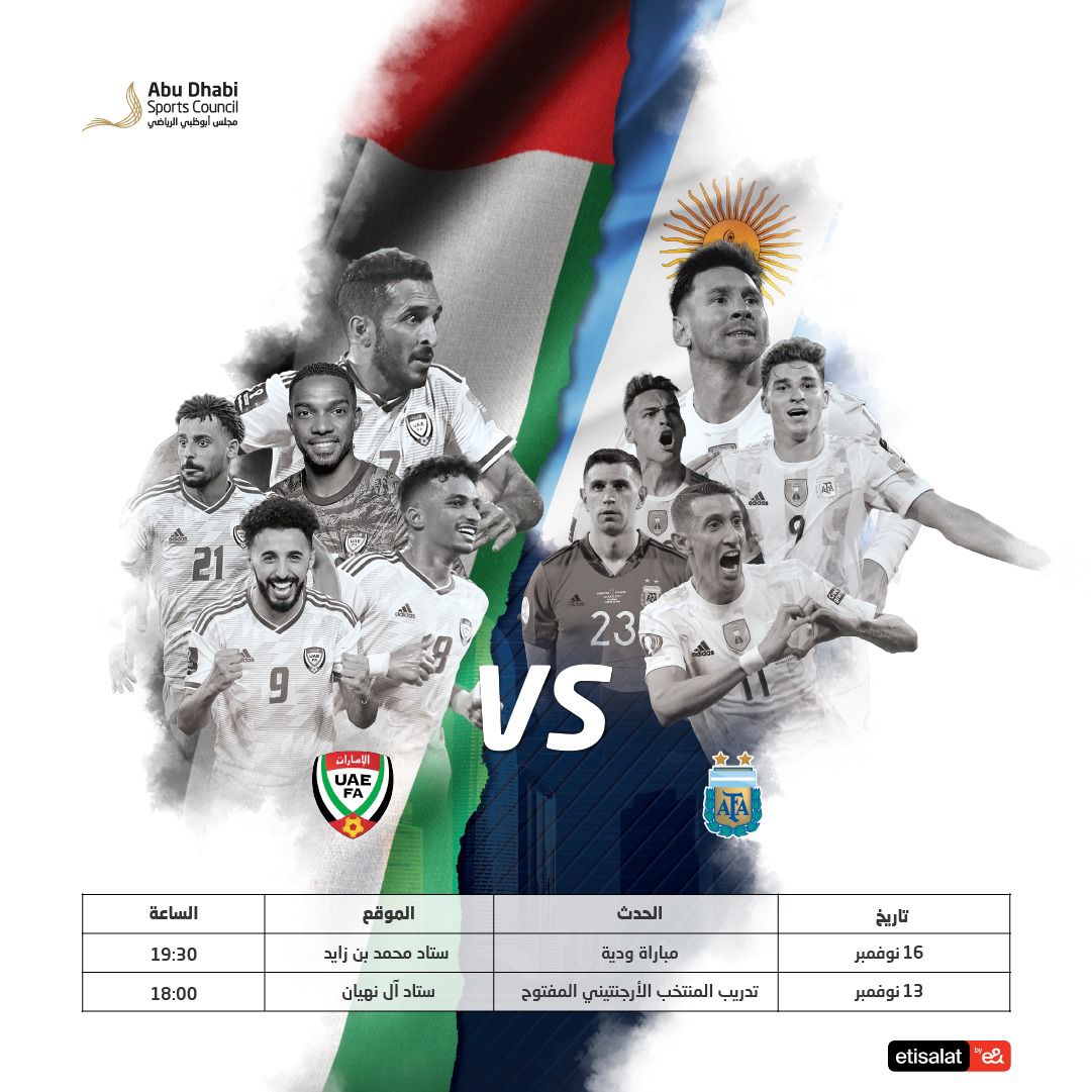 أعلن مجلس أبوظبي الرياضي عن طرح تذاكر المباراة الودية بين منتخب الإمارات الوطني ونظيره الأرجنتيني التي ستقام في العاصمة أبوظبي في 16 نوفمبر القادم، على استاد محمد بن زايد في العاصمة أبوظبي، الساعة السابعة والنصف مساءً، كما أعلن المجلس عن طرح تذاكر التدريب المفتوح الذي يقيمه المنتخب الأرجنتيني على ستاد آل نهيان يوم 13 نوفمبر الساعة السادسة مساءً، وذلك عبر الموقع الإلكتروني الرسمي لتيكيت ماستر www.ticketmaster.ae.