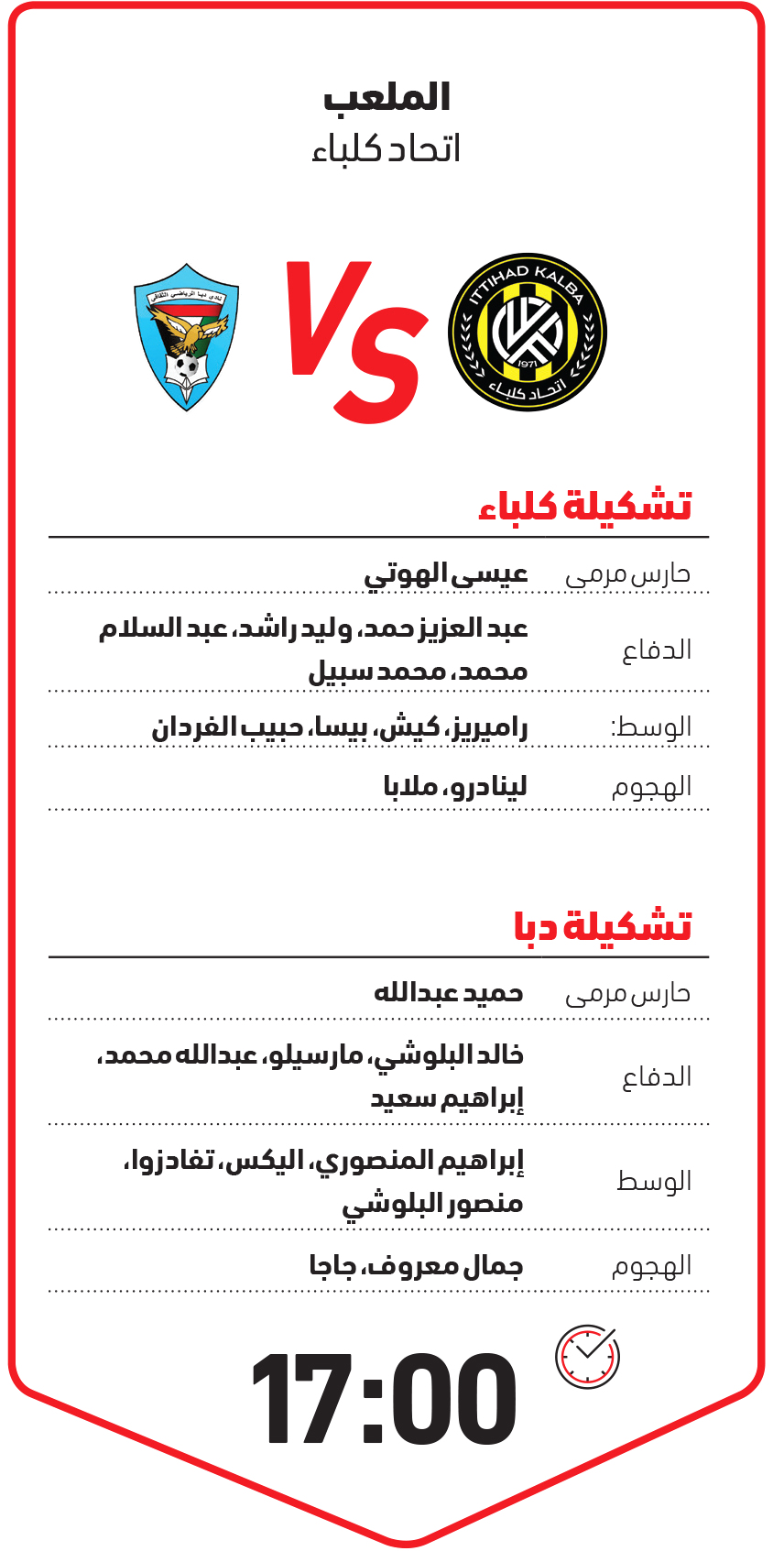 يستقبل كلباء في الخامسة مساء اليوم على ملعبه بالساحل الشرقي جاره دبا الفجيرة في ديربي خاص بالجولة السادسة من دوري أدنوك للمحترفين، ويأمل كلباء الفوز والتقدم خطوة جديدة نحو المقدمة وكان الفريق تعادل سلبياً أمام شباب الأهلي في الجولة الماضية ولكنه خسر مواجهته الأولى في ذهاب الكأس أمام الوحدة، ويلعب كلباء بصفوف مكتملة ويحتل المركز الثامن برصيد 7 نقاط ،وفي المقابل يتطلع دبا الفجيرة إلى إيقاف مسلسل الهزائم والتي جعلت «النواخذة» يحتل المركز الأخير برصيد نقطة وتعتبر المباراة الأولى للمدرب غريغوري في الدوري ،وينتظر جمهور دبا تحقيق الفريق الفوز الأول في الدوري.