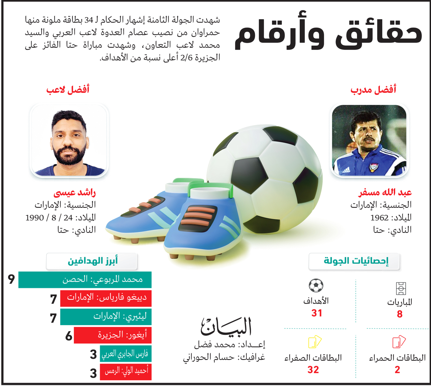 وقاد اللاعب «المخضرم» راشد عيسى فريقه حتا لاعتلاء صدارة الدوري بعد أن أسهم بتسجيل ثلاثة أهداف «هاتريك» من أهداف فريقه الستة في مرمى الجزيرة الحمراء ليتوج نجماً لهذه الجولة من دون منازع.