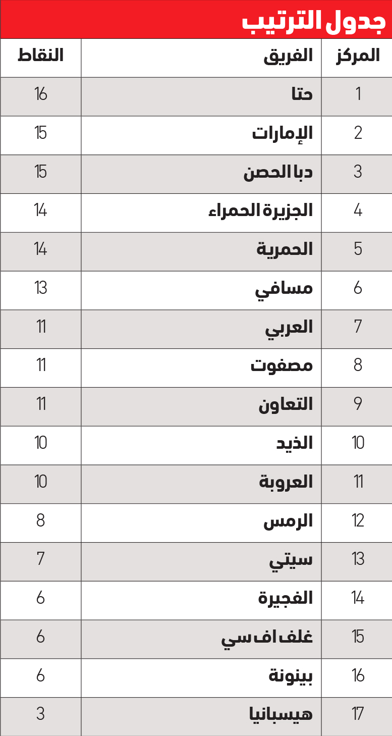 جدول الترتيبالمركزالفريقالنقاط 1حتا16 2الإمارات15 3دبا الحصن154الجزيرة الحمراء145الحمرية146مسافي137العربي118مصفوت119التعاون1110الذيد1011العروبة10 12الرمس8 13سيتي7 14الفجيرة6 15غلف اف سي6 16بينونة617هيسبانيا3