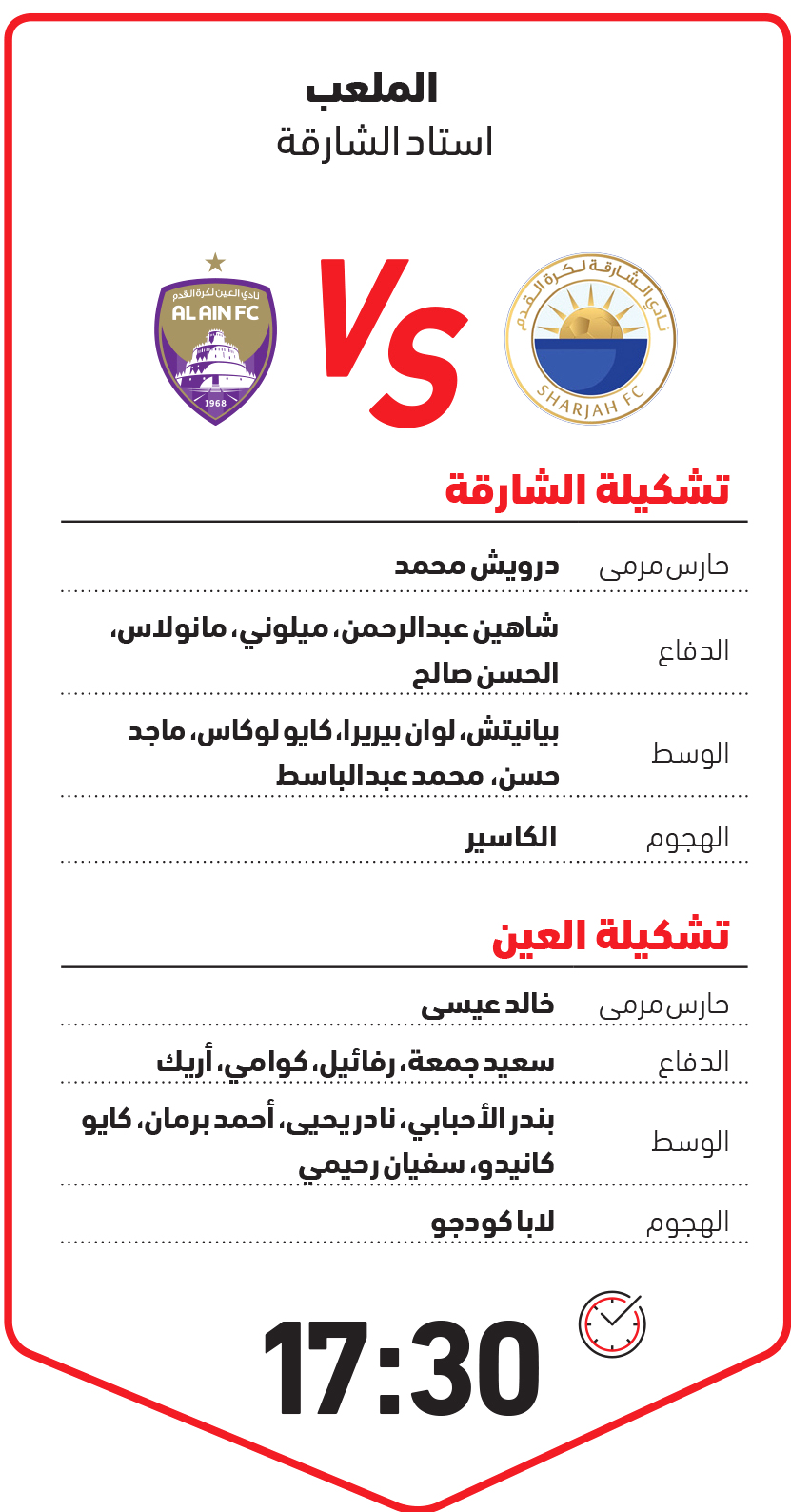 ولا يتوقع حدوث تغيير يذكر على التشكيلة التي يخوض بها كوزمين مدرب الشارقة مباريات الدوري، ووصف كوزمين استعدادات فريقه لمواجهة العين بالجيدة، مرجحاً أن تكون المباراة صعبة كون فريقه يواجه حامل اللقب، وهو فريق متميز ويعد من بين أفضل الفرق في الدوري، وقال: العين يمتلك عدداً كبيراً من اللاعبين الدوليين وهو ما يمنحه قوة، والمباراة مهمة جداً لمعرفة الوضع الفني قبل فترة التوقف وهي في الوقت نفسه مباراة جماهيرية، من المتوقع أن تحظى بمتابعة كبيرة، وهو الأمر الذي يمنح الدافع للفريقين لتقديم مباراة حماسية، وفي ختام حديثه تمنى كوزمين أن يقدم فريقه الأداء المتوقع وينجح في الخروج بنقاط المباراة.