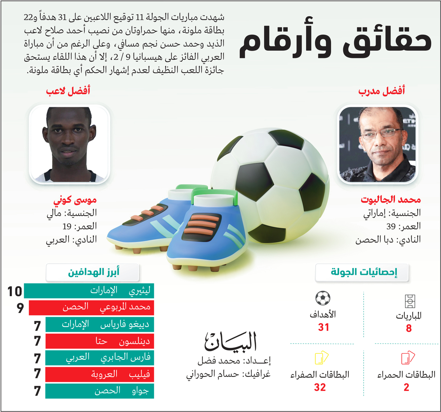 واستعاد الإمارات بريقه، ووضع حداً لهزائمه الأخيرة، بعد أن عاد من ملعب الحمرية «العنيد» بالنقاط الثلاث، ليصل إلى النقطة 18 في المركز الرابع، ويتقاسم المركز مع الحمرية ومسافي، والأخير كان نجم الأسبوع بجدارة، بعد أن تمكن من إلحاق الهزيمة بالإعصار، مزيحاً إياه عن الصدارة.