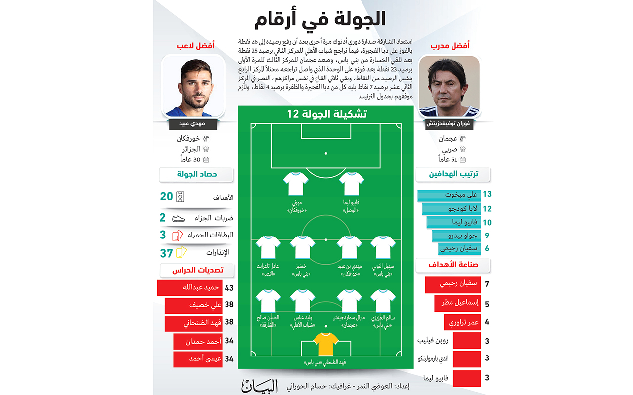 وكذلك بني ياس الذي قفز للمركز التاسع بعد حصد 4 نقاط في آخر جولتين بالتعادل مع العين والفوز على شباب الأهلي في ملعبهما، ومستوى الفريق في تصاعد ويكفي القول إنه فرض أسلوبه على شباب الأهلي مما مكنه من تحقيق الفوز. وأيضاً فريق خورفكان الذي تطور كثيراً في عهد المدرب الوطني عبد العزيز العنبري، تنظيمياً ودفاعياً، كما أشار إلى تأزم موقف كلباء الذي فقد نقاطاً عديدة خلال الجولات الماضية، ويجب على المدرب احتواء غرفة الملابس حتى يعود الفريق لتقديم الأداء القوي.