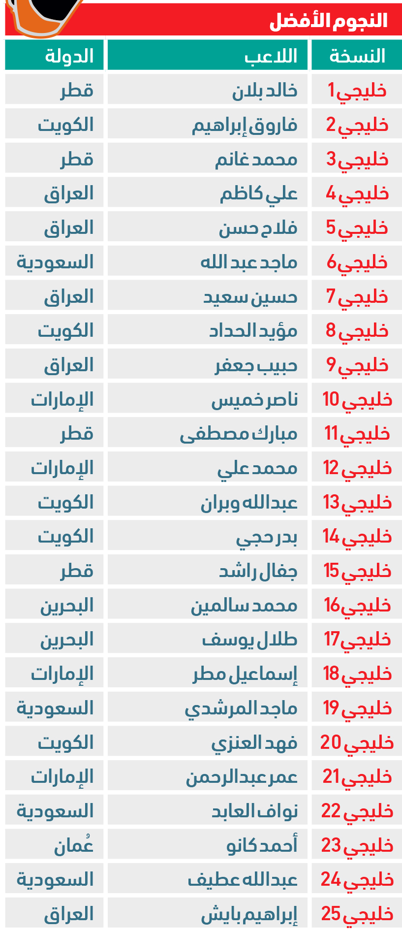 كما جادت بطولة كأس الخليج العربي خلال نسخها الـ 25، بأسماء مميزة من النجوم الذين زينوا قائمة «اللاعب الأفضل» في جميع تلك النسخ، منهم الإماراتيون، ناصر خميس ومحمد علي وإسماعيل مطر وعمر عبد الرحمن، في «خليجي 10 و12و18 و21»، والسعوديون، خالد التركي وماجد المرشدي ونواف العابد وعبدالله عطيف، في «خليجي 4 و19 و22 و24»، والكويتيون، فاروق إبراهيم ومؤيد الحداد وعبدالله وبران وبدر حجي وفهد العنزي، في «خليجي 2 و8 و13 و14 و20»، والقطريون، خالد بلان ومحمد غانم ومبارك مصطفى وجفال راشد، في «خليجي1 و3 و11 و15»، والبحرينيان، محمد سالمين وطلال يوسف، في «خليجي 16 و17»، والعمانيان، غلام خميس وأحمد كانو، في «خليجي 7 و23»، والعراقيان، هادي أحمد وحبيب جعفر، في «خليجي5 و9».