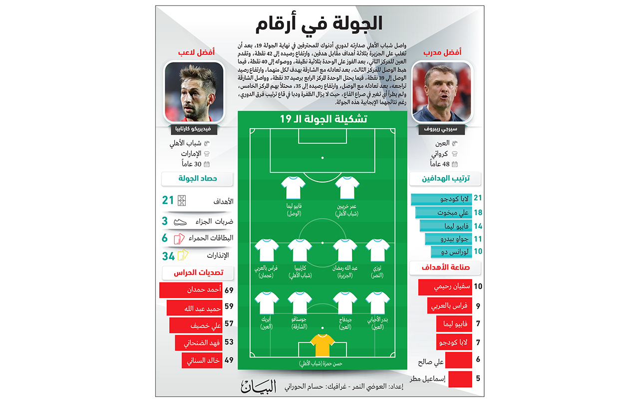 وأوضح أن الجولة جاءت متميزة على المستوى الفني والتكتيكي، واقترنت بالنسق السريع في اللعب، وسجل خلالها 22 هدفاً بمعدل (3.1 أهداف في المباراة)، متجاوزاً المعدل التهديفي العام للدوري (3 أهداف في المباراة)، وأكد العبيدي أن صحوة العين في الفترة الأخيرة مستمرة، بعد أن قدم مباراة تكتيكية بامتياز في الكلاسيكو، وكان أكثر حضوراً بدنياً وذهنياً من منافسه الوحدة، الذي لم يوفق مدربه في تجهيز لاعبيه، خاصة من الناحية الذهنية، فغاب التركيز عن اللاعبين، فكثرت الأخطاء، أبرزها خطأ الحارس محمد الشامسي، والذي مكن العين من تسجيل الهدف الأول، وفي غياب رد الفعل من لاعبي الوحدة، غابت الروح والشراسة المطلوبة في مثل هذه المباريات، وتمكن لاعبو العين من السيطرة على وسط الميدان، من خلال الضغط العالي، وسرعة استخلاص الكرة والاستحواذ عليها، وبالتالي، خلق العديد من فرص التسجيل، وتسجيل هدفين، حسم بهما النتيجة، والتي اقترنت بالأداء.