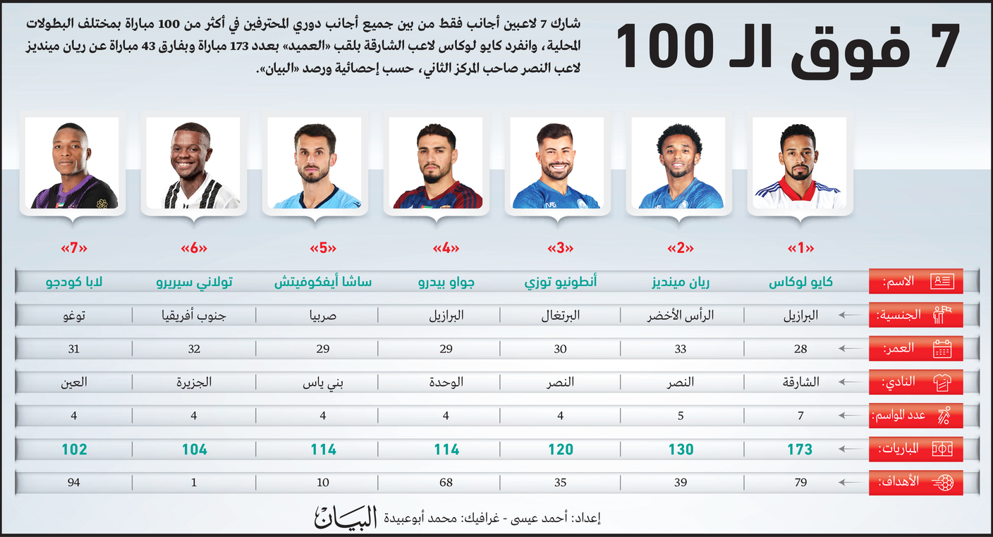 وأظهرت إحصائية أجرتها «البيان» لمشوار الأجانب مع مختلف الأندية، أن هنالك 7 لاعبين فقط تجاوزت مشاركاتهم 100 مباراة، بقيادة كايو لوكاس عميد الأجانب الذي خاض مبارياته بشعاري العين والشارقة، يليه ريان مينديز مهاجم النصر الذي خاض 130 مباراة في 5 مواسم مع الشارقة والعميد، ويأتي زميله أنطونيو توزي في المركز الثالث بعدد 120 مباراة في 4 مواسم، ورابعاً جواو بيدرو مهاجم الوحدة الذي لعب 114 مباراة خاضها مع الظفرة وبني ياس والوحدة في 4 مواسم، وخامساً ساشا افكوفينتش مدافع بني ياس الذي لعب 114 مباراة، وسادساً تولاني سيريرو لاعب وسط الجزيرة بعدد 104 مباريات، وسابعاً لابا كودجو مهاجم العين بعدد 102 مباراة.