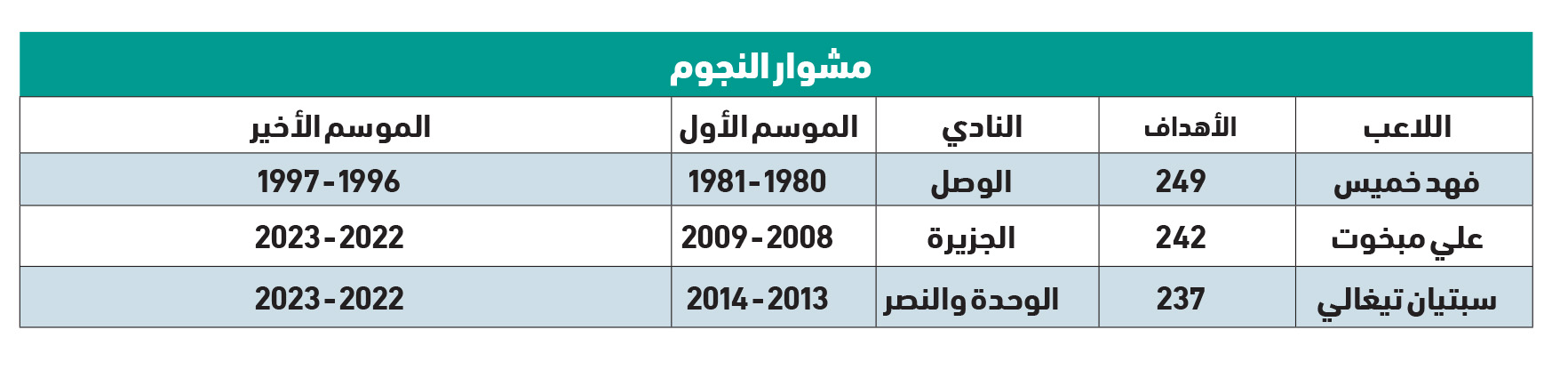 وجاءت محصلة الـ 249 هدفاً للهداف الأسمر فهد خميس، من مشاركاته في جميع البطولات المحلية والخارجية التي ظهر فيها في الوصل، فيما حل علي مبخوت، ثانياً بـ 242 هدفاً، بينما جاء الدولي سبستيان تيغالي، ثالثاً برصيد 237 هدفاً، سجلها طوال مسيرته مع الوحدة ثم النصر فالوحدة حالياً.