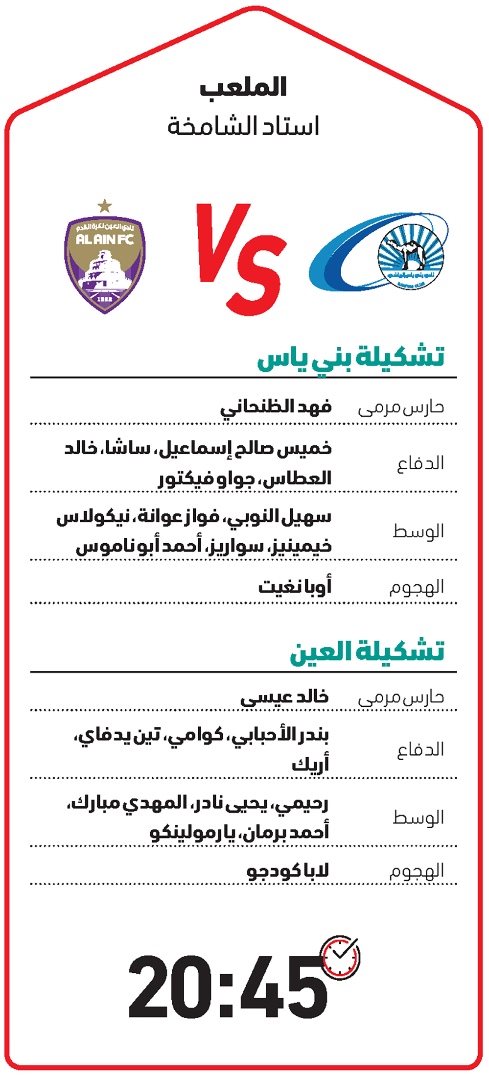 يستضيف بني ياس على ملعبه في الشامخة في الثامنة و45 دقيقة من مساء اليوم، فريق العين، ضمن منافسات الجولة الـ 24 من دوري أدنوك للمحترفين.