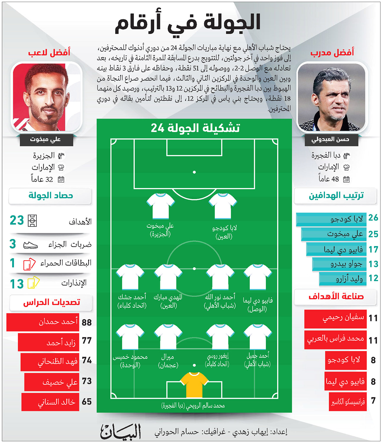 والذي يلتقي في آخر جولتين مع الشارقة، والظفرة الذي هبط بالفعل إلى دوري الهواة، وقدم أداء باهتاً في الجولة 24، بينما يلتقي البطائح مع النصر والعين، في مواجهتين صعبتين».