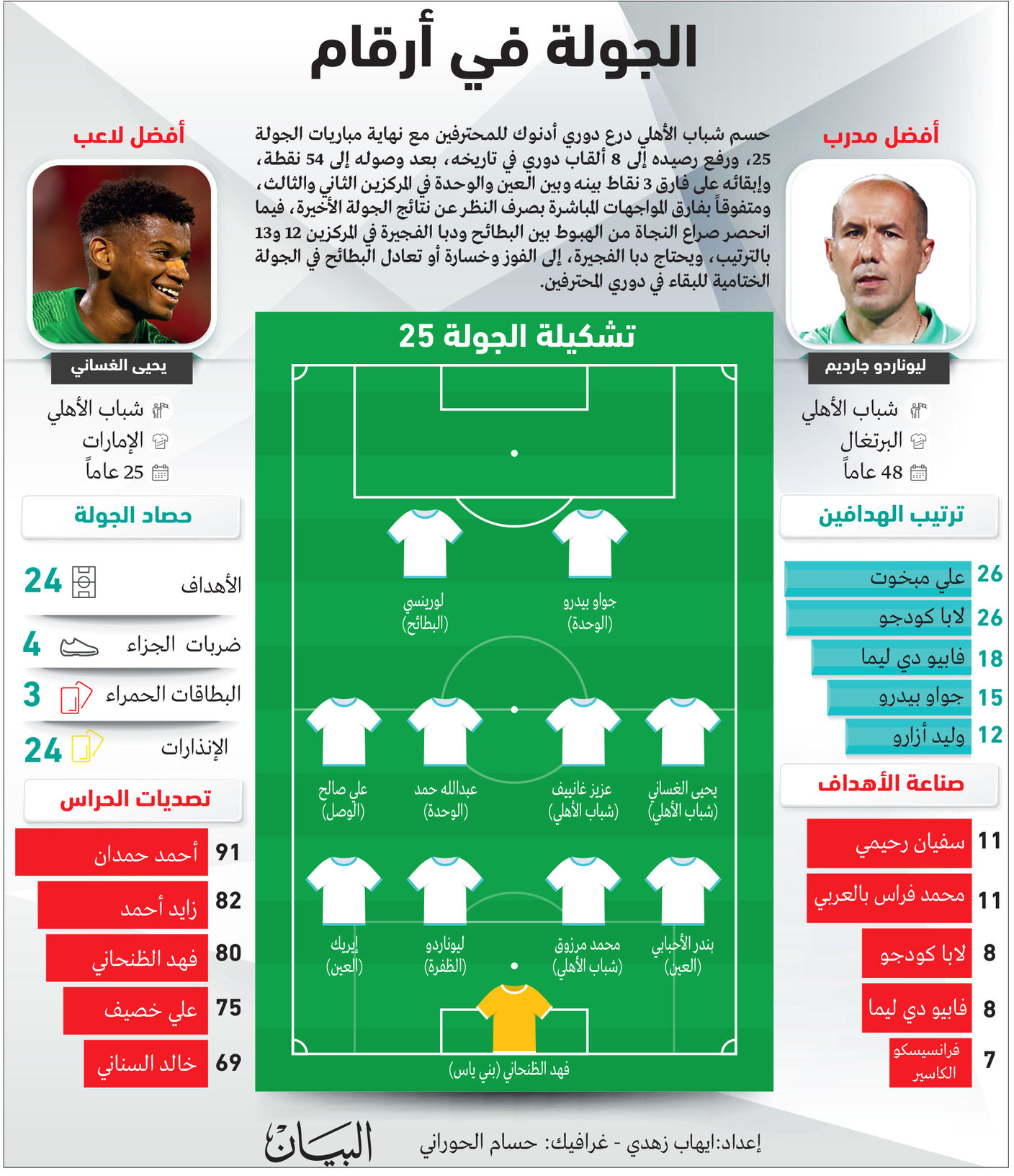 أما عن ظهور بقية الأندية في مباريات الجولة 25، أوضح لاعب الجزيرة السابق، أن أغلب الأندية باستثناء الوحدة والعين والنصر، لعبت دون ضغوط صراع القمة أو الهبوط، ولذا جاء أداءها جيداً وقدمت كرة جميلة، واستمتعت الجماهير بأداء قوي من الوصل أمام العين، وبني ياس أمام شباب الأهلي، وبلقاء اتحاد كلباء وخورفكان، وتحرر الظفرة من الضغوط، وقدم مباراة جيدة أمام الجزيرة، وحقق فوزاً بنتيجة كبيرة، وهو انتصار معنوي مهم، وبحث عنه الفريق طويلاً في الدور الثاني، إلا إنه تحقق في الوقت الضائع، وبعدما تأكد هبوط الفريق، ليبدأ رحلة كفاح العودة إلى المحترفين في الموسم المقبل.