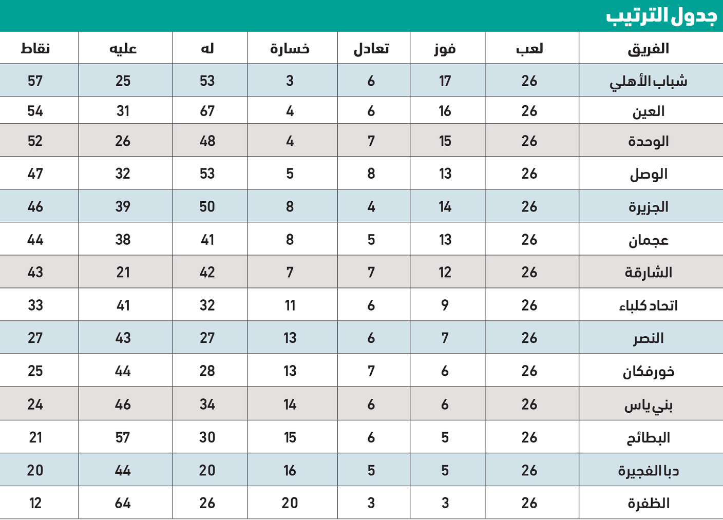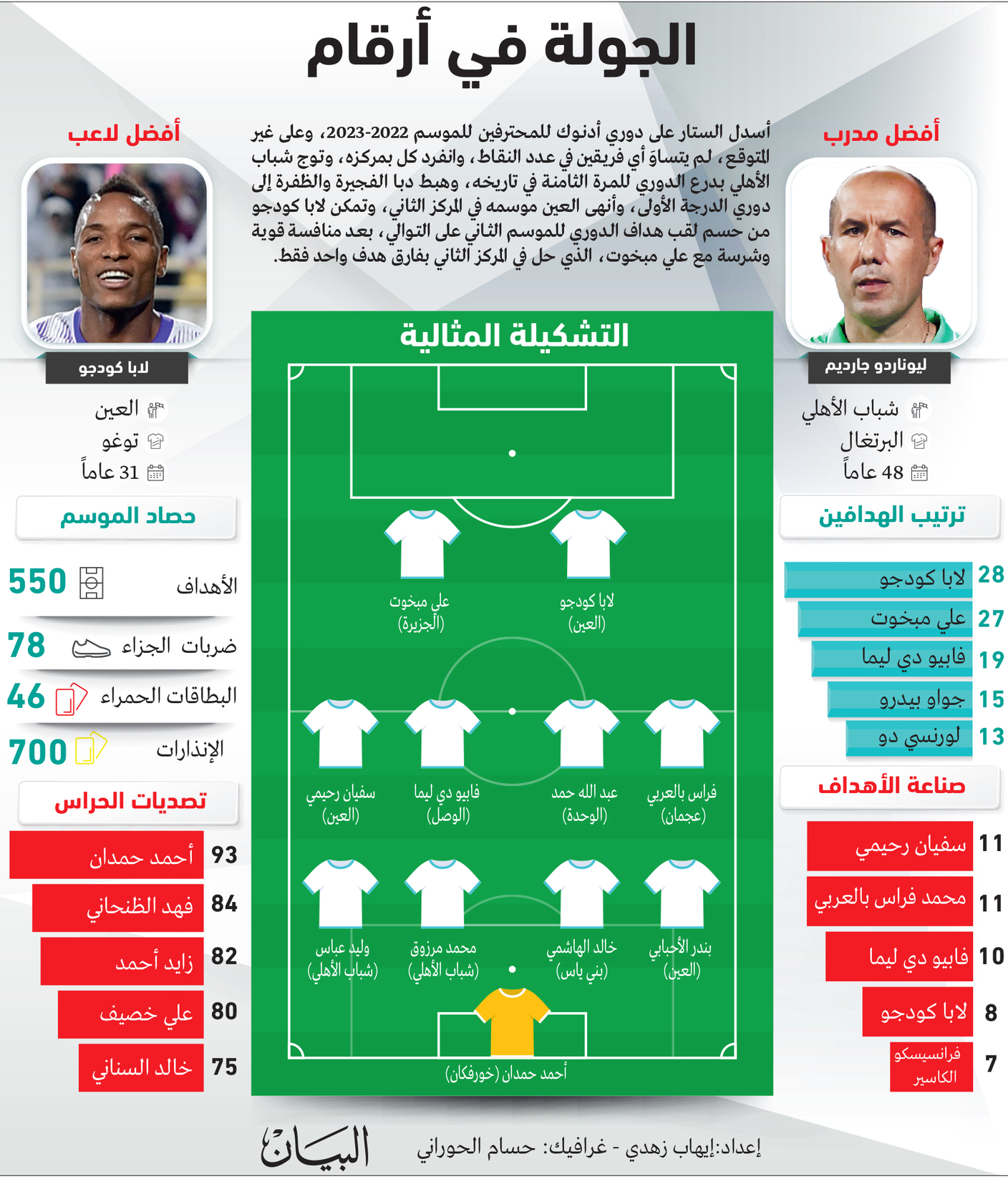 وجاءت الجولة الأخيرة لتسدل الستار على مغامرات دبا الفجيرة الذي قدم في الجولات الأخيرة أداء ولا أروع، ولا ندري السر وراء تأخره في تقديم هذا الأداء، لينتهي به الأمر بالهبوط مرافقاً الظفرة إلى الدرجة الأولى وبقاء البطائح في معجزة قد لا تتكرر كثيراً ولعل النقطة الفارقة مع دبا الفجيرة هي الحاسمة لمغامرة جديدة تحتاج إلى مقومات أكثر من أجل تفادي الهبوط مستقبلاً، موسم 2023 كان استثنائياً في كل تفصيلاته حتى مع الفرق الكبيرة التي ابتعدت عن طيب خاطر وقررت عدم المحاولة من جديد، وأبرزها العميد النصراوي، رباعي المقدمة شباب الأهلي والعين والوحدة والوصل كانوا الأبرز والأحق بالمراكز المتقدمة، وحتى فرق المنطقة الآمنة حاولوا تقديم الأفضل ولكن كرة القدم لا تمنح اللقب إلا لبطل وحيد فقط وقد كان.