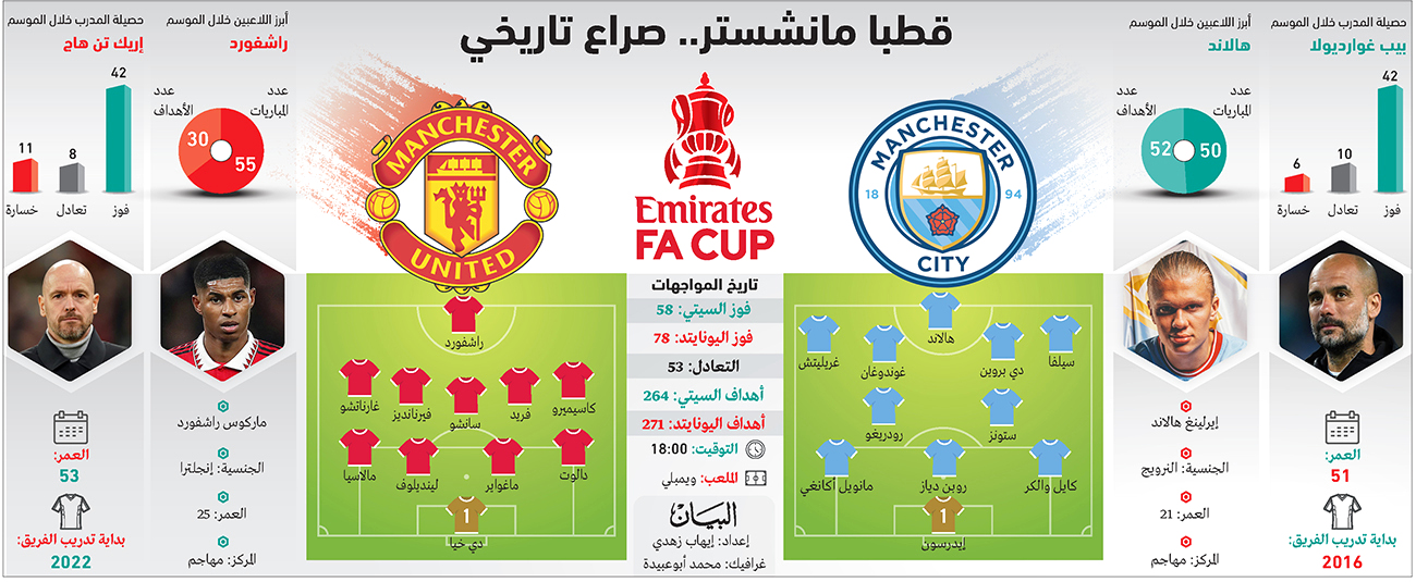 يلتقي في السادسة مساء اليوم «بتوقيت الإمارات» باستاد ويمبلي في لندن، فريقا مانشستر سيتي ومانشستر يونايتد في ديربي تاريخي بنهائي كأس الاتحاد الإنجليزي لكرة القدم، أقدم بطولة كروية في إنجلترا، وتحظى المواجهة باهتمام بالغ على كل المستويات الفنية والجماهيرية.