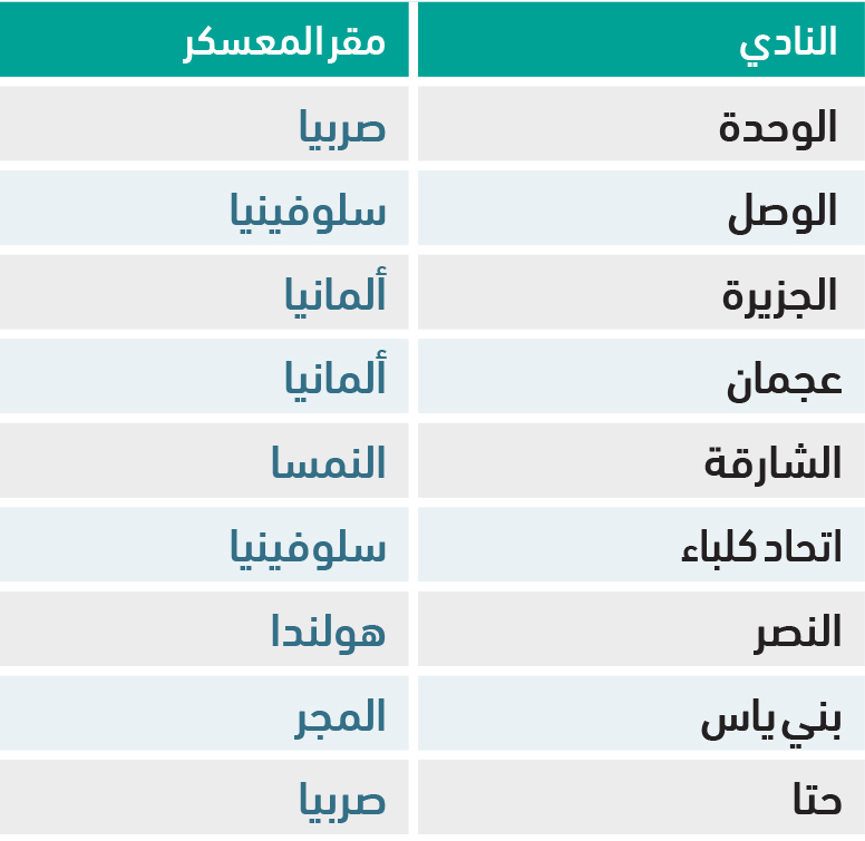 ومن المتوقع أن تتجه بعثة فريق الشارقة إلى النمسا لإقامة معسكر الإعداد الخارجي وهي وجهته في العام الماضي مع المدرب الروماني أولاريو كوزمين، كما تعتبر النمسا ضمن الخيارات الرئيسية لفريق العين إضافة إلى هولندا وسويسرا. ولم يحسم فريق شباب الأهلي بطل دوري أدنوك للمحترفين، وجهته النهائية لإقامة المعسكر الخارجي الذي لن يخرج عن دائرة الدول المذكورة أعلاه، إلى جانب فريقي البطائح والإمارات.
