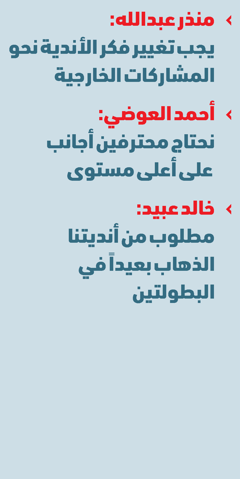 وأكد منذر عبدالله مدرب الوحدة السابق، المحلل الفني، أن أنديتنا مطالبة بالتركيز على المشاركات الخارجية في دوري أبطال آسيا والبطولة العربية، مشيراً إلى أن اعتبار مشاركاتها لمجرد المشاركة وعدم الرغبة في المنافسة على اللقب لن يساعد الكرة الإماراتية على استعادة تصنيف متقدم على الصعيد القاري.