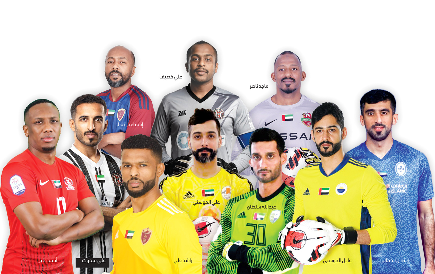ويظهر في القائمة 6 حراس مرمى، ماجد ناصر، علي خصيف، علي الحوسني، عادل الحوسني، عبدالله سلطان، راشد علي، وجميعهم يشاركون بصفة أساسية مع فرقهم باستثناء راشد علي الحارس الثاني بالوحدة، ما يؤكد أن حراس المرمى هم الأطول عمراً في الملاعب والأكثر قدرة على الاستمرارية.
