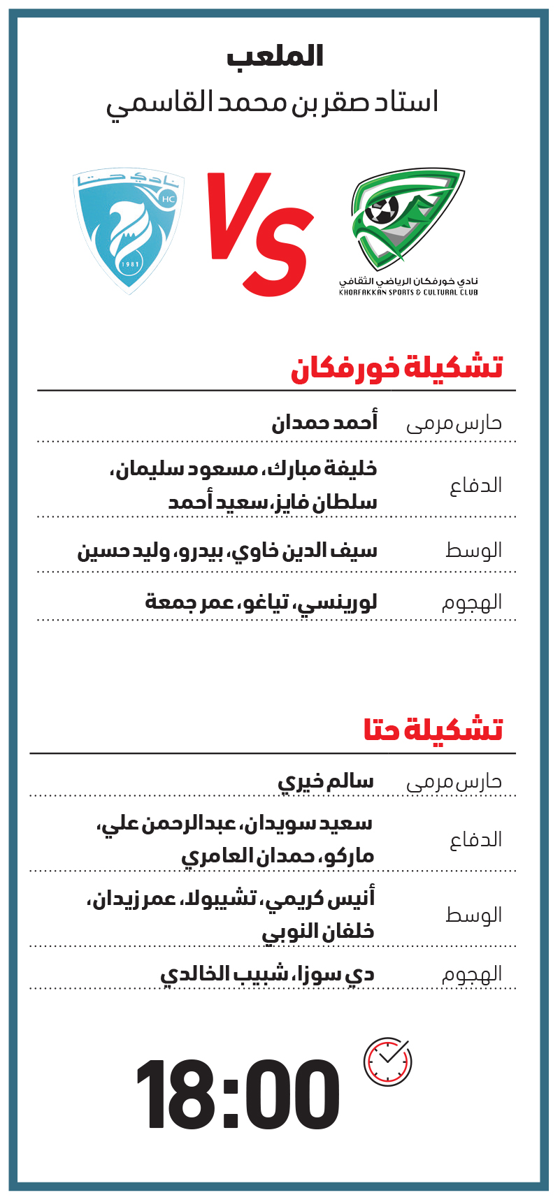 وتعتبر هذه المواجهة الثالثة بين خورفكان وحتا في دوري المحترفين، حيث تفوّق خورفكان في المواجهتين السابقتين بنتيجةٍ إجمالية (4 - 2). وستشهد المواجهة مشاركة العديد من العناصر الجديدة في تشكيلة الفريقين اللذين يعتبران من أكثر الأندية نشاطاً في فترة الانتقالات الصيفية.
