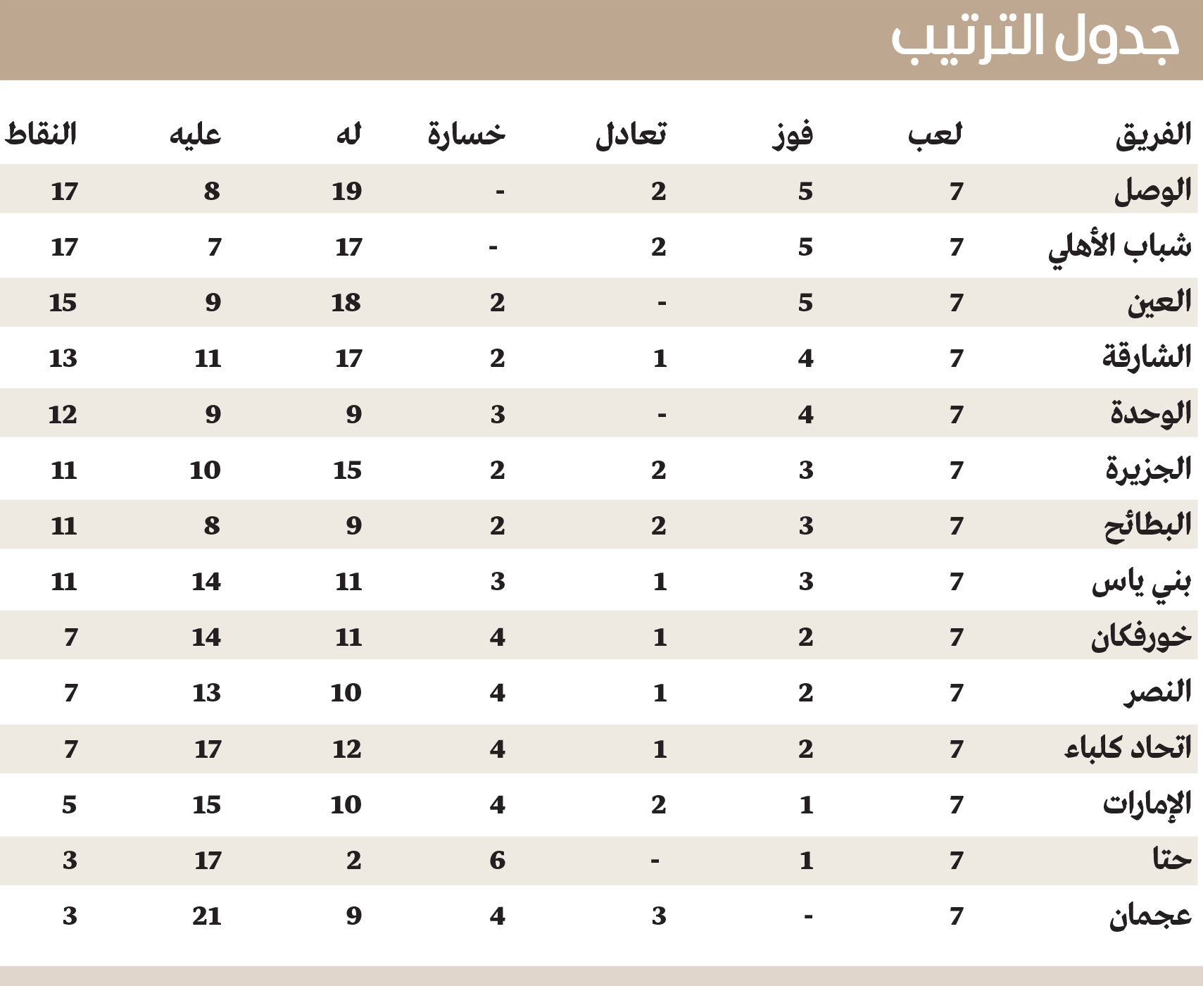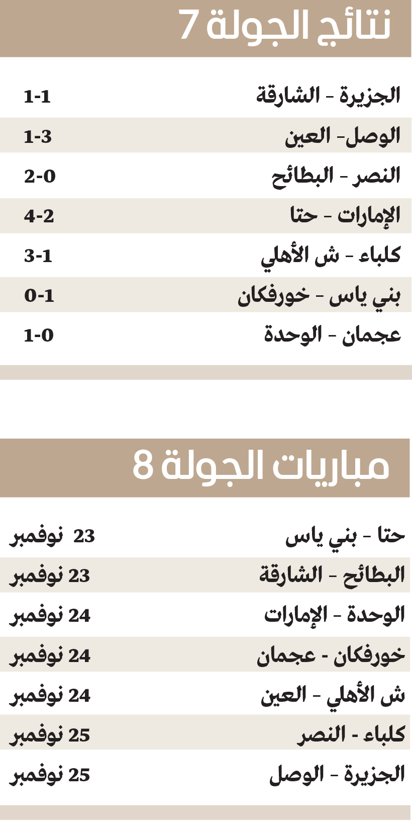 وفي مباراة الوحدة مع عجمان سيطر الوحدة في الشوط الأول، ولكن التسرع أمام المرمى وغياب الدقة في اللمسة الأخيرة كانت من أسباب عدم تسجيل أهداف باستثناء الهدف الوحيد الذي سجله الفريق، أما عجمان فقدم مردوداً فردياً وجماعياً واعداً في الشوط الثاني، وكان قريباً من إدراك التعادل لولا تألق الحارس راشد علي وتصديه لضربة جزاء على مرتين، لاعبو عجمان في حاجة إلى تجاوز الحالة الذهنية وقلة الثقة قبل فوات الأوان، أما مباراة بني ياس وخورفكان فكانت عبارة على مباراة ودية لا أكثر ولا أقل، وفاز فيها الفريق الذي كان اكثر إصراراً وحضوراً ذهنياً.