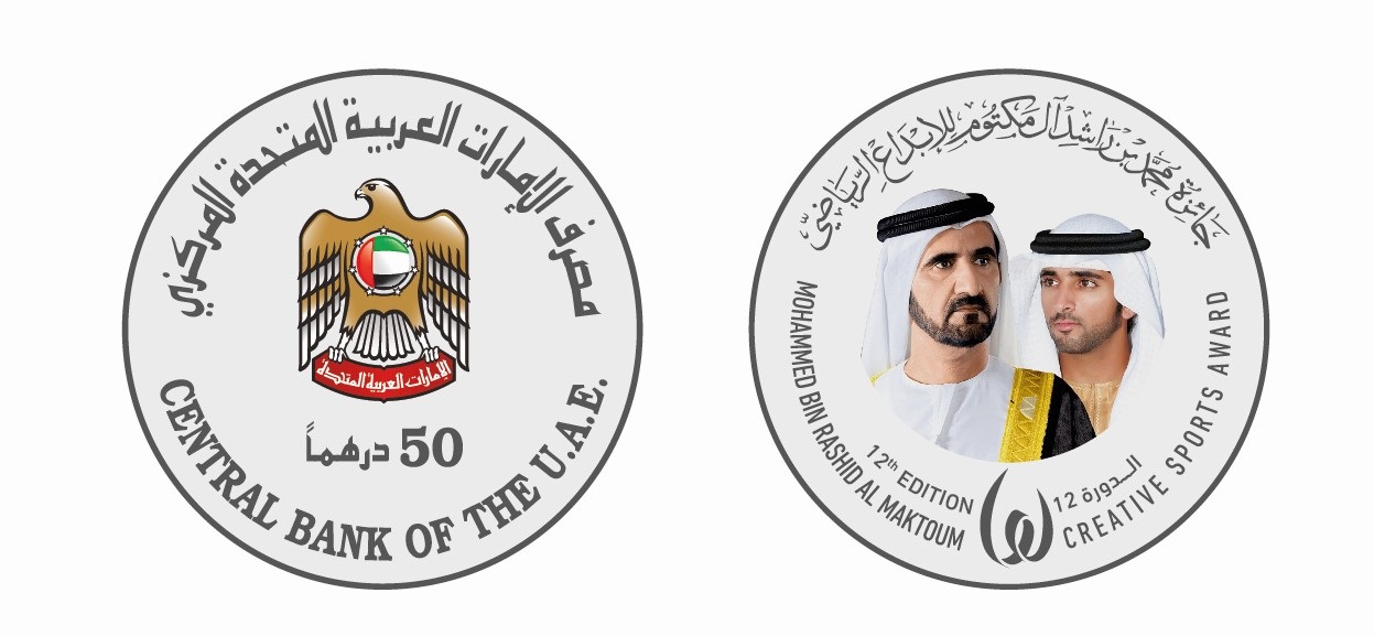 يتضمن الوجه الأمامي للمسكوكة الاولى من نوعها على الإطلاق شعار واسم "الدورة الثانية عشرة لجائزة محمد بن راشد آل مكتوم للإبداع الرياضي" باللغتين العربية والإنجليزية، بالإضافة إلى صورة صاحب السمو الشيخ محمد بن راشد آل مكتوم، نائب رئيس الدولة رئيس مجلس الوزراء حاكم دبي رعاه الله ، وسمو الشيخ حمدان بن محمد بن راشد آل مكتوم، ولي عهد دبي رئيس المجلس التنفيذي، فيما يتضمن الوجه الخلفي شعار واسم "مصرف الإمارات العربية المتحدة المركزي" باللغتين العربية والإنجليزية والقيمة الاسمية للمسكوكة، وتم الكشف عنها بشكل مبتكر من قبل سمو الشيخ منصور بن محمد بن راشد آل مكتوم رئيس مجلس دبي الرياضي، وبمشاركة أحد الرياضيين من نادي سكاي دايف للرياضات الجوية.
