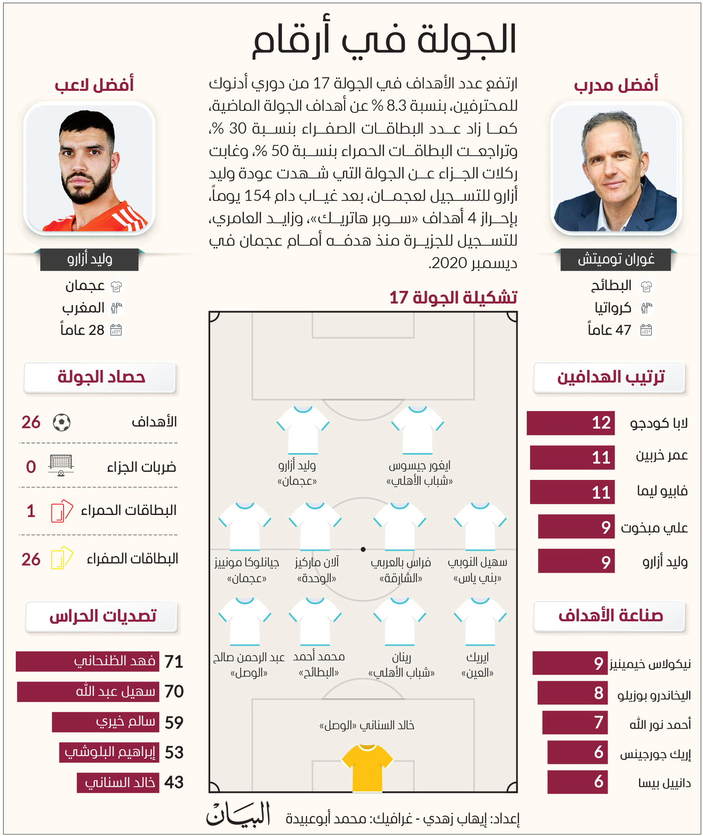 وتحدث عن دوامة الهبوط إلى دوري الدرجة الأولى، والتي تجذب بقوة فريقي الإمارات وحتا، قائلاً: الإمارات قام بتدعيم صفوفه بشكل جيد في الانتقالات الشتوية الأخيرة، ولكني أعتقد أن «القطار فات»، لأنه لا تزال هناك فوارق فنية كبيرة بينه وبينه اتحاد كلباء الأقرب إليه بالترتيب بالتواجد في المركز 12، رغم أن الفارق بينهما 6 نقاط فقط، مع تواجد الإمارات في المركز قبل الأخير برصيد 8 نقاط، في حين، بات حتا الأقرب كثيراً إلى الهبوط، وأرى أن الإمارات وحتا يحتاجان إلى معجزة في الجولات الأخيرة للبقاء في دوري أدنوك للمحترفين.