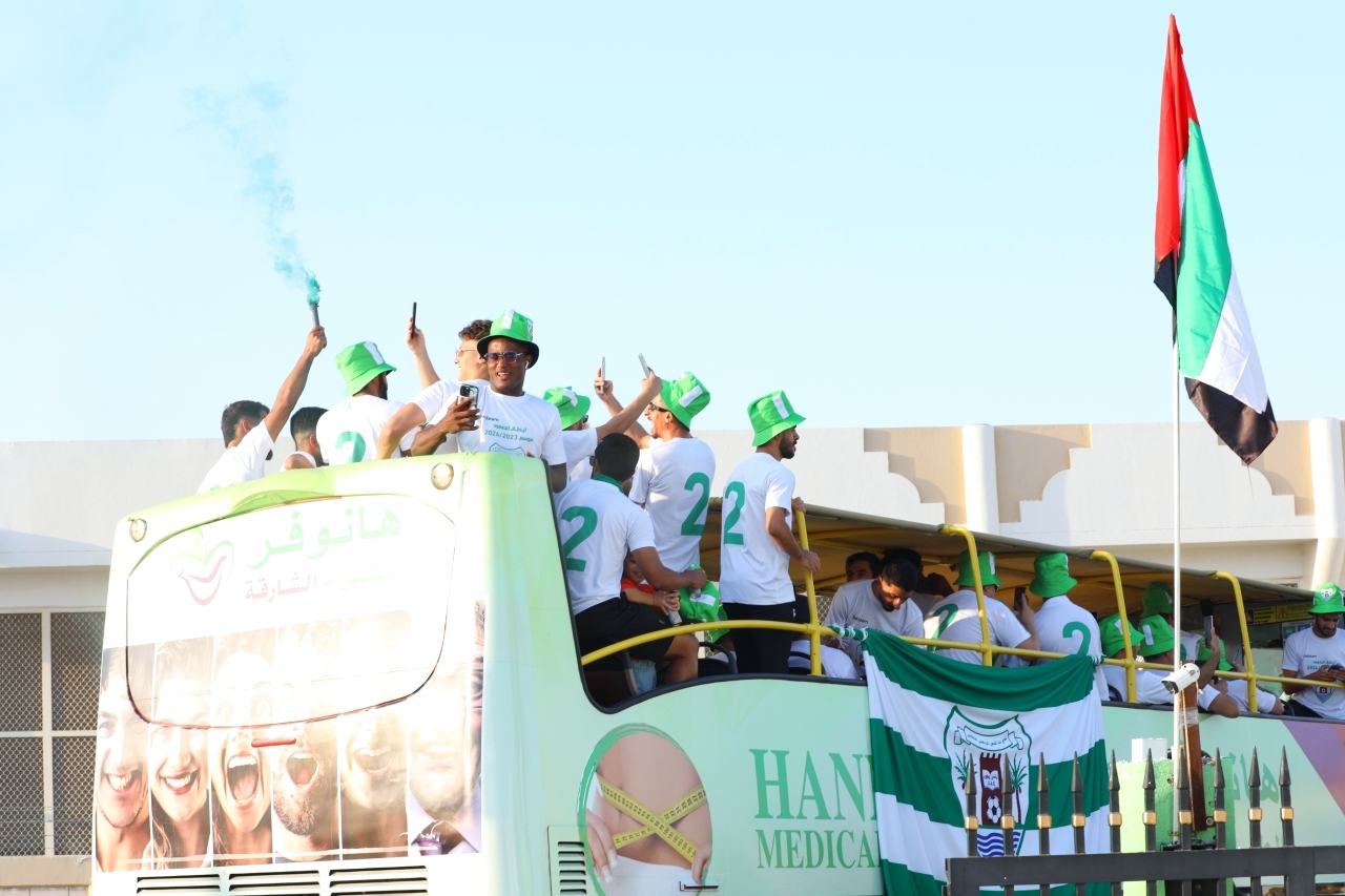 وانطلقت مسيرة الأفراح بـ«الطريقة الأوروبية» من مقر النادي بعد أن استقل لاعبو الفريق والجهازان الفني والإداري حافلة مكشوفة جابت شوارع المدينة الرئيسية مروراً بالكورنيش ثم المرور على جزيرة دبا الحصن، ورافقت حافلة اللاعبين أعداد كبيرة من السيارات الخاصة للجمهور، لتعود المسيرة مرة أخرى إلى النادي، حيث أعدت الإدارة برنامجاً حافلاً.