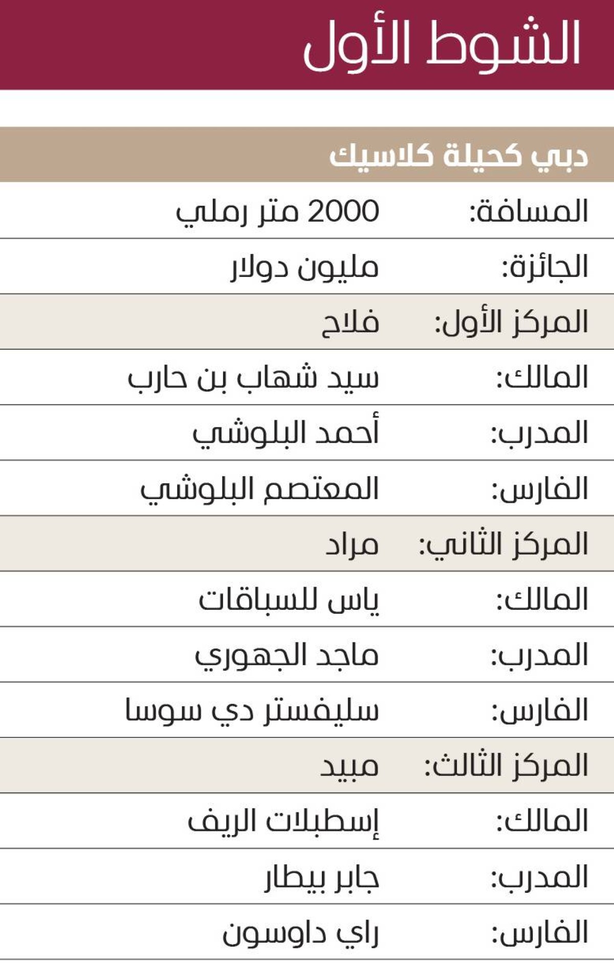 ويعد سباق (دبي كحيلة كلاسيك) من أهم المحطات العالمية للخيول العربية الأصيلة، كونه يجمع نخبة الجياد من مختلف القارات، وبهذا الفوز يؤكد الجواد (فلاح) جاهزيته الكبيرة وسجله الحافل، بعد تألقه السابق في سوبر ساترداي ليفتتح الأمسية الأغلى في العالم بانتصار عُماني وسط أجواء احتفالية كبرى.