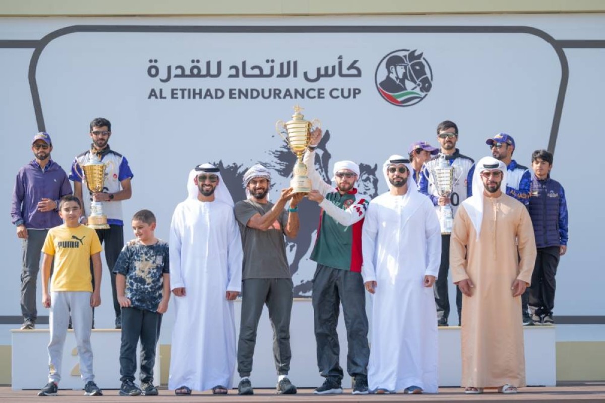 توج الفائزين بالمراكز الثلاثة الأولى عبدالله النقبي مدير إدارة الخدمات المساندة في الاتحاد، ومحمد الجنيبي مدير الفعاليات بقرية بوذيب العالمية للقدرة، وسلطان الحوسني رئيس قسم التسويق بالاتحاد.