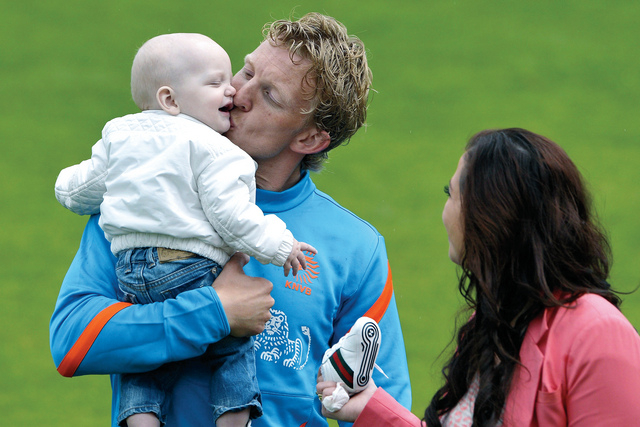 كويت يتدرب برفقة العائلةا ف ب)أصر المهاجم الهولندي ديرك كويت على أن تصحبه زوجته وابنه في معسكر منتخب الطواحين الهولندي الذي يقيمه في مدينة لوزان السويسرية استعداداً لبطولة الأمم الأوروبية 2012 واللقطة له حاملاً ابنه ايدان بالقرب من زوجته غيترود خلال التمرين