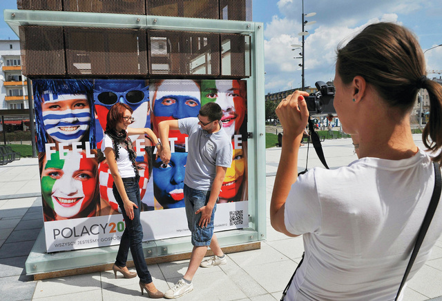 لم تتبق سوى سويعات على انطلاق البطولة الاوروبية "يورو 2012" فبدأت الجماهير انفعالاتها مبكرا استعدادا لمتابعة الحدث الكبير والاستمتاع به ومنهم هذا الثنائي الذي طلب من احد المارة التقاط صوره تذكارية له امام احد ملصقات البطولة المنتشرة في كافة انحاء مدينة وارسو البولندية.
