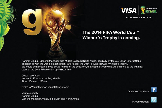 وزيارة الكأس الي دبي جاءت برعاية شركة فيزا الشرق الاوسط وشمال افريقيا التي تتشرف بدعوة عشاق الكره للحضور ومشاهدة الكأس في احتفالية يستضيفها برج خليفة في الحادية عشرة من صباح الأول من أبريل المقبل.