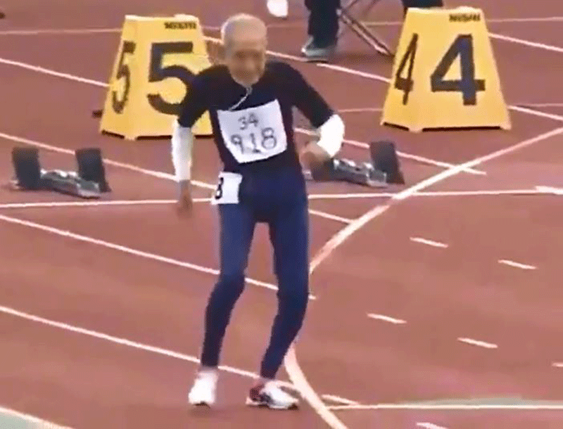 موقع (@nippon_ar) نشر فيديو لسباق السرعة 100م عدو، بمشاركة عدائين يبلغ من العمر 102 عام، وعلى الرغم من احتلاله المركز الأخير إلا أنه تمكن من إنهاء السباق، وذلك هو الأهم، موحيا لنا بأنه شاب فوق الـ 100 سنة.