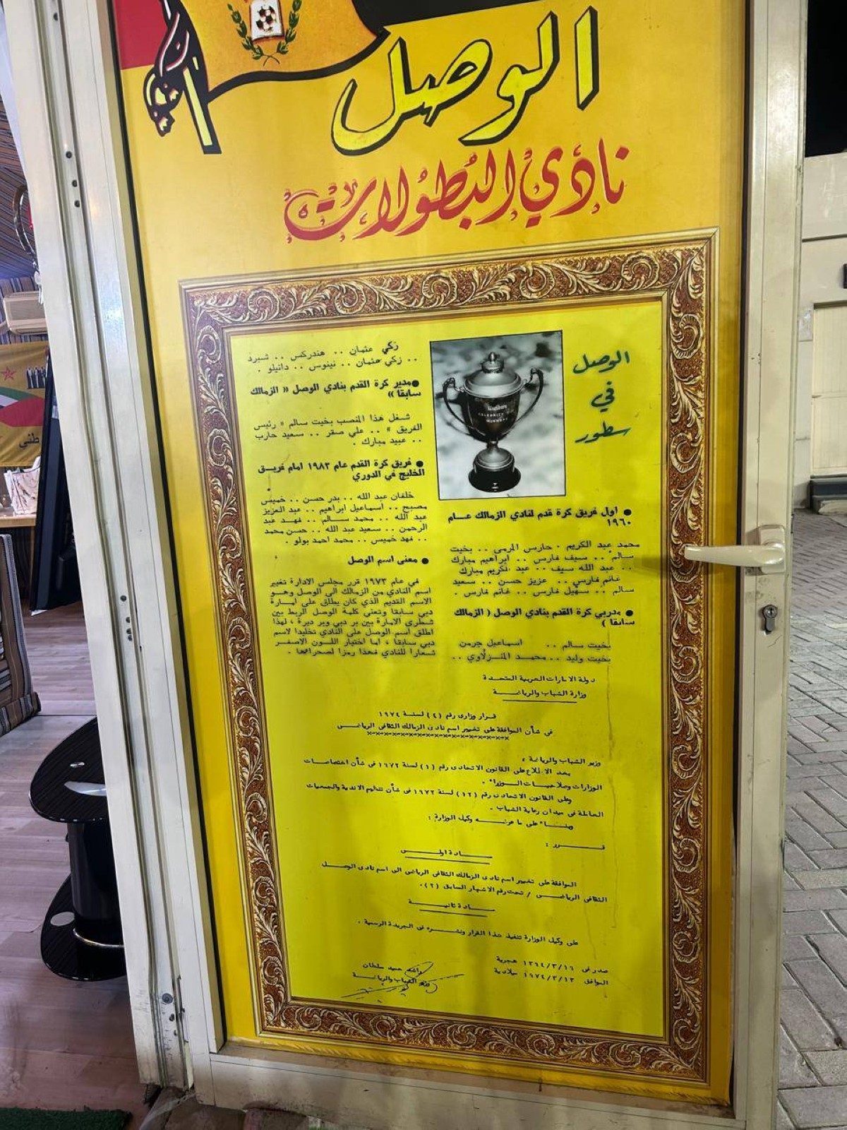 تتصدر الخيمة الاجتماعية بنادي الوصل، يسار المدخل الرئيس في استاد «زعبيل»، المشهد لتكون شاهدة على تاريخ وحاضر النادي، عبر أرشيف بصري حافل بالصور التي توثق مناسبات ومحطات مختلفة، يعود عمر بعضها إلى أكثر من 60 عاماً، لتشكل مع الذاكرة البشرية المتقدة رواية مسيرة «الإمبراطور» السابقة.