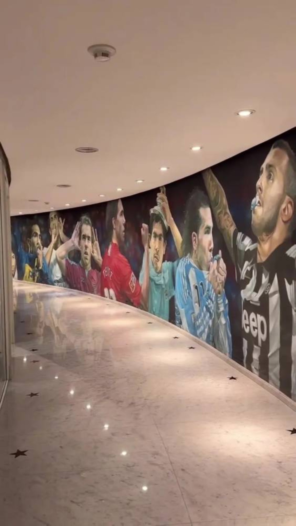 كما أن هناك غرفة معيشة ملكية تتوسطها أريكة من الجلد الكريمي المرصع بالفضة، تحيط بها كؤوس الحذاء الذهبي وجوائز لاعب المباراة.
