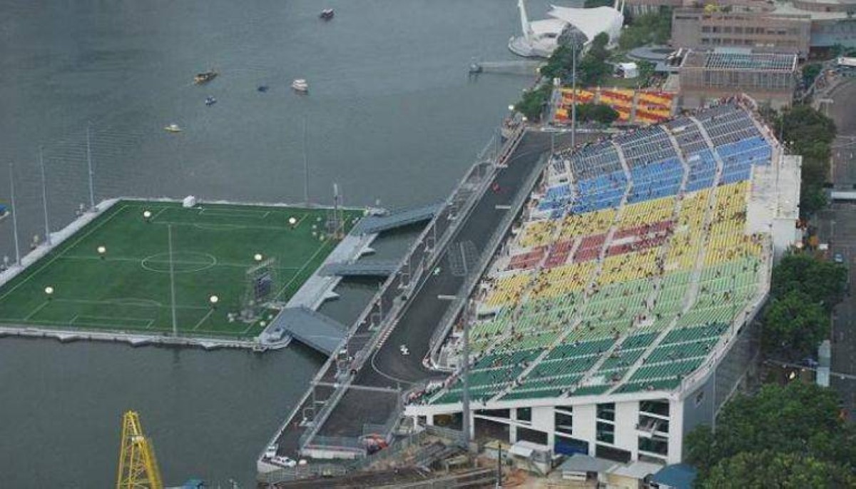 ويوجد في سنغافورة، ملعب «مارينا باي» العائم على منصة ضخمة تطفو فوق المياه، وأرضية الملعب تقع فوق الماء بينما توجد المدرجات على اليابسة المقابلة، ما يمنح الحضور مشهداً مدهشاً لأفق المدينة وناطحات السحاب المحيطة بالمكان.