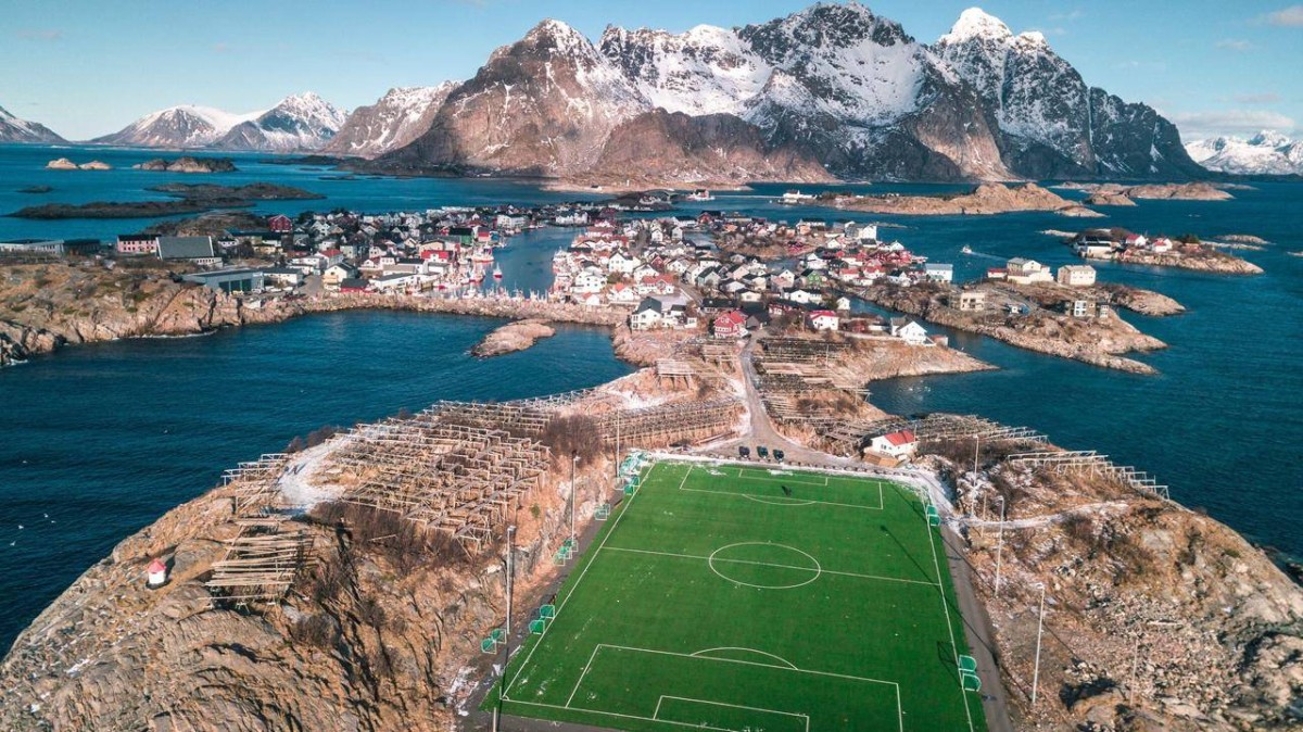 أما في النرويج، فيقع ملعب «هينينغسفير» فوق جزيرة صخرية صغيرة تحيط بها مياه البحر من كل جانب، ورغم بساطة منشآته وغياب المدرجات الكبيرة، فإن موقعه الطبيعي المذهل وسط البحر والجبال جعله واحداً من أكثر ملاعب كرة القدم تصويراً في العالم.