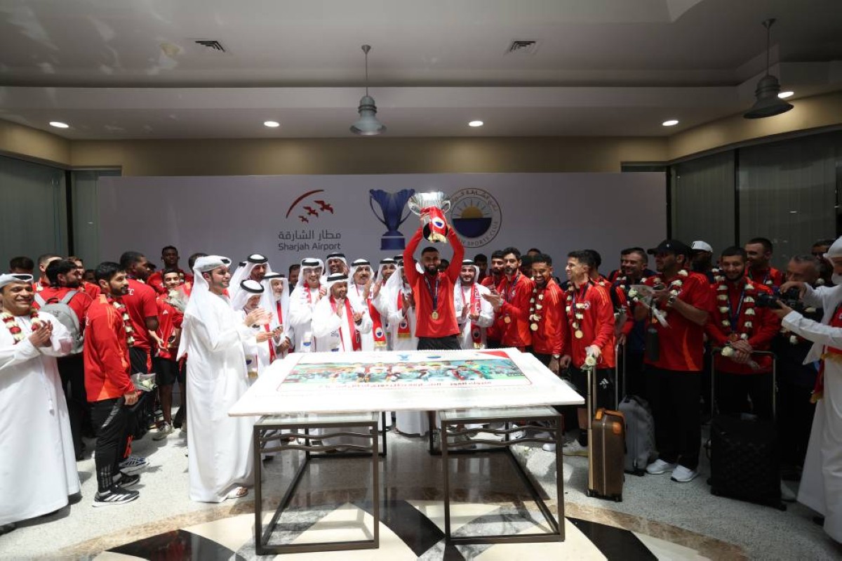 في مشهد مليء بالبهجة والفخر، قامت بعثة نادي الشارقة الرياضي بقطع كعكة الاحتفال داخل صالة كبار الشخصيات في مطار الشارقة الدولي، عقب وصولها الظافر من المشاركة الآسيوية التي تُوِّجت فيها بلقب دوري أبطال آسيا 2.