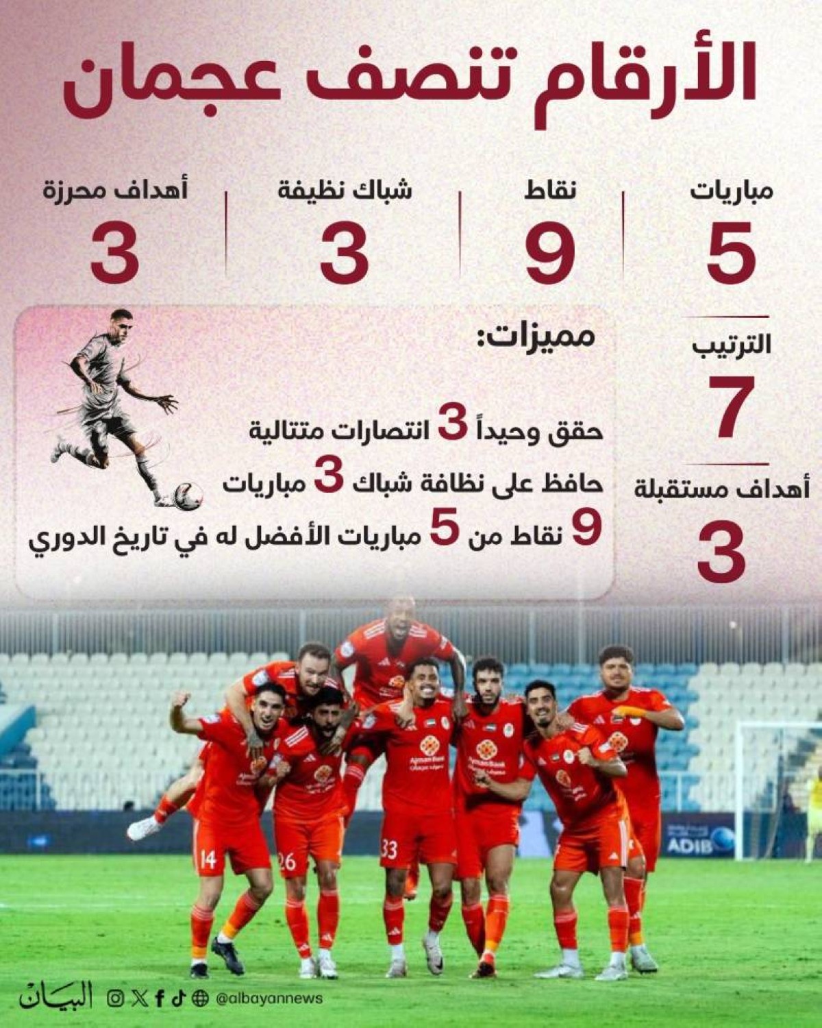 تميزت انتصارات عجمان بسمات خاصة، حيث جاءت جميعها بالنتيجة ذاتها 1-0 على حساب البطائح، الشارقة، وبني ياس، مع حفاظه، وحيداً من بين أندية الدوري، على نظافة شباكه في المباريات الثلاث، ليؤكد قوة خط دفاعه وانضباطه التكتيكي والأداء الجماعي الذي يعكس العمل الكبير للجهاز الفني بقيادة المدرب غوران ولاعبيه.