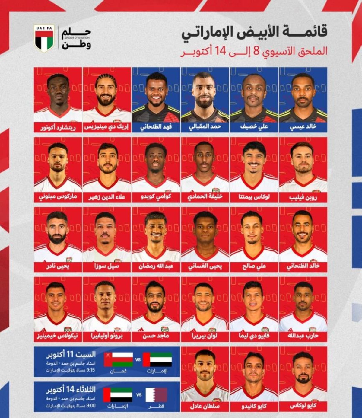أعلن اتحاد الكرة عن القائمة المختارة من قبل الروماني أولاريو كوزمين، مدرب منتخبنا الوطني الأول، لخوض مباراتي منتخبي عمان وقطر، يومي السبت والثلاثاء المقبلين، على استاد جاسم بن حمد، ضمن تصفيات المجموعة الأولى للملحق الآسيوي المؤهل إلى نهائيات كأس العالم 2026.